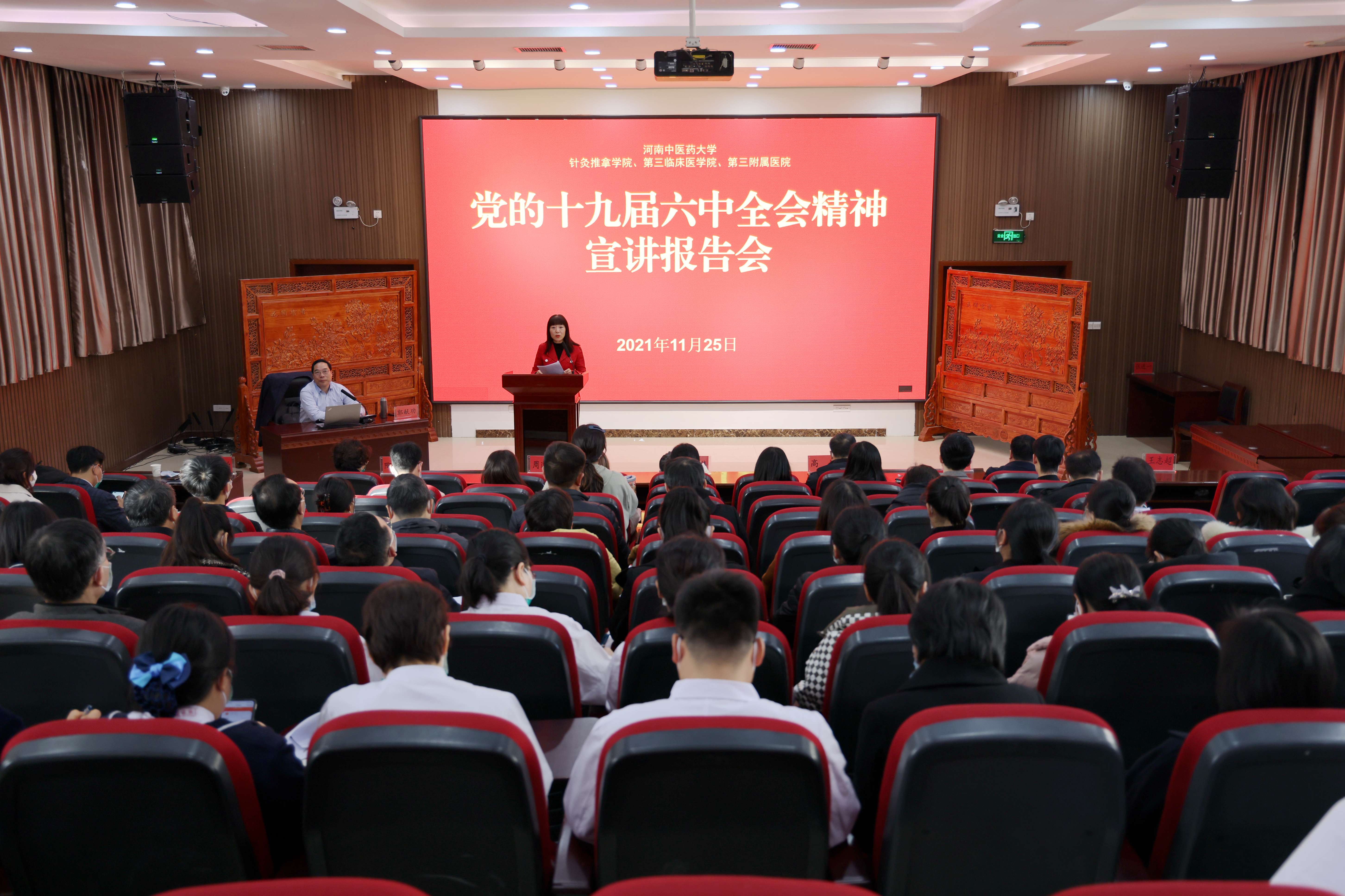 本网讯(文/潘向昆 图/田辉) 为深入学习宣传贯彻党的十九届六中全会精神,按照校党委和医院党委安排部署,2021年11月25日上午,三附院举行“党的十九届六中全会精神”宣讲报告会,邀请河南省委党校党建教研部主任郭献功教授为三附院党员干部作专题辅导,系统解读全会精神。院党委书记周运峰、院长张大伟及班子成员出席,院纪委委员、各党总(支)部书记、中层干部和支部宣传、纪检委员及党员、民主党派、学生代表参加报告会。三附院党委副书记焦钧主持会议。