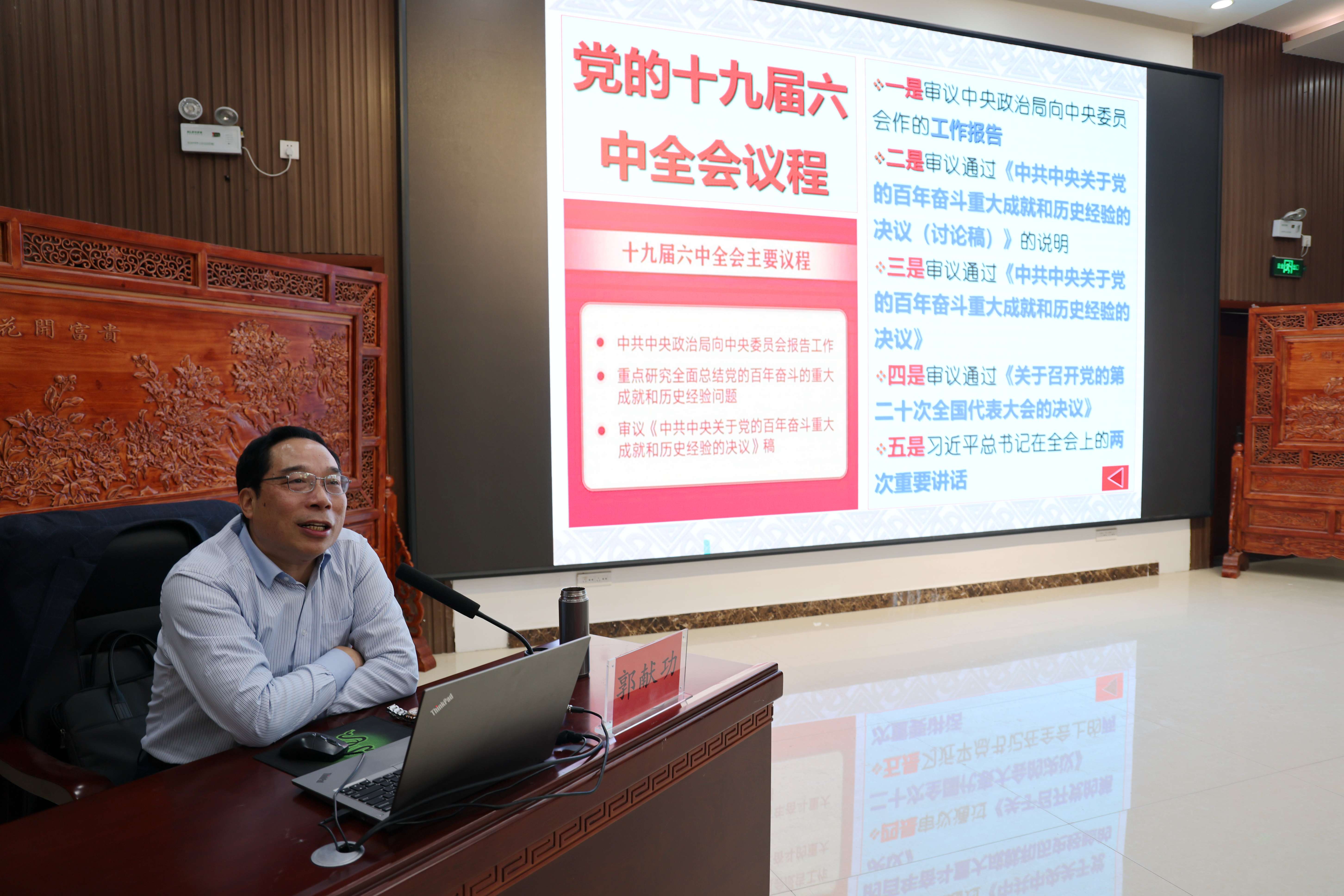 郭教授首先讲解了“全会”的概念和历次全会召开的意义,从本次全会充分肯定了中央政治局一年工作、系统阐述了四个时期的重大成就、概括了理论创新的三次飞跃、深刻总结了历史意义和宝贵经验、全面吹响了建设强国的前进号角、明确要求以优异成绩迎接二十大等六个方面对全会精神进行了系统解读。他运用生动鲜活的案例、数据、图表进行讲解,整个报告既有深厚的理论高度,又有现实的具体剖析,内涵丰富、深入浅出,对于进一步学习领会全会精神,进一步深刻认识党的十八大以来取得的历史性成就、历史性变革、深刻认识中国共产党百年奋斗的历史意义和历史经验具有重要的指导意义。