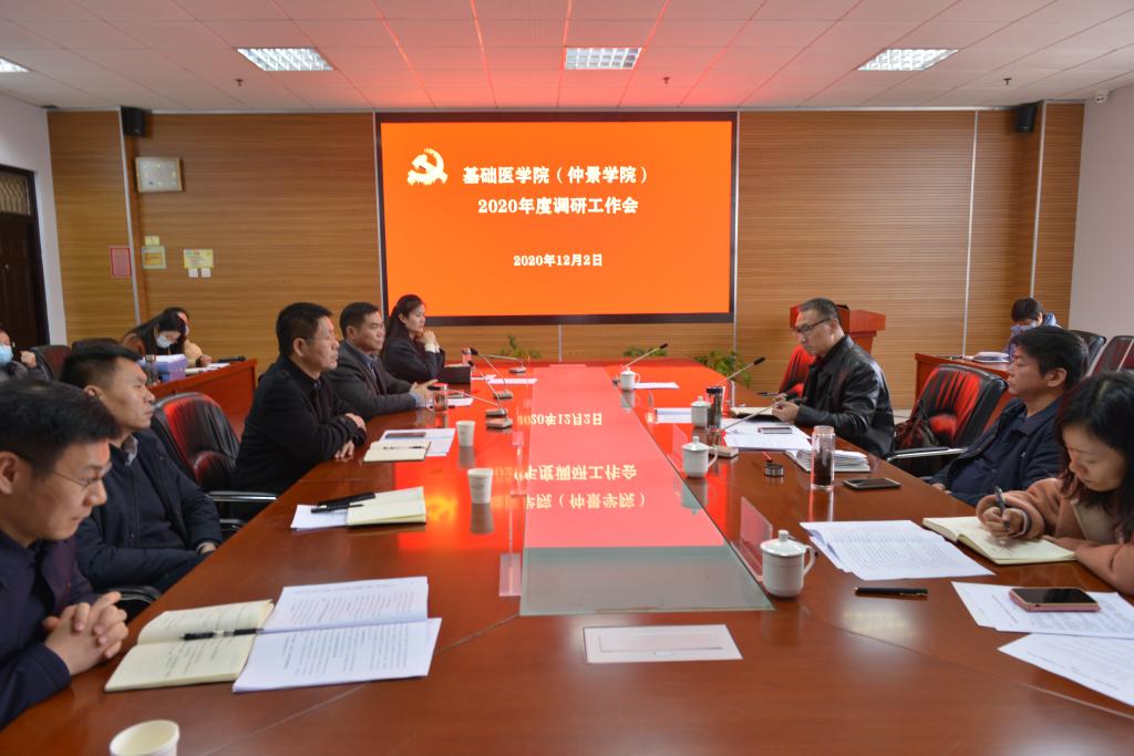本网讯(文图/刘颖)2020年12月2日,校党委委员、副校长李建生,发展规划处处长孙可兴一行到基础医学院(仲景学院)调研指导工作。基础医学院学院全体班子成员、支部书记、科室主任和行政科室人员参加调研。院长李根林主持会议。