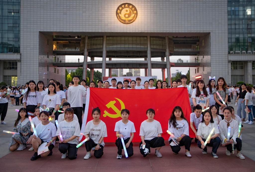 活动开始前,同学们手举党旗,挥舞荧光棒,组成“1921”和“2021”的字样,针灸推拿学院无与伦比轮滑社团精心准备了以《没有共产党就没有新中国》为背景的“荧光轮滑向党跑”轮滑表演。