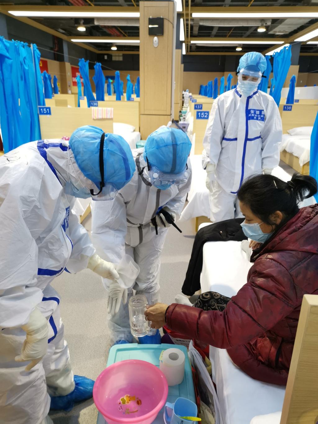 温世宝说,其实他知道进舱工作的医护队员工作更辛苦。方舱内工作繁忙,咽痛、口渴是常态;队员们防护服内的衣服要几度被汗水浸湿又被体温暖干,因为每值一个班,队员们在舱内要连续工作近8个小时。拿医疗队的张娟娟来说,她2月16日下午16:00时入舱,23:40分出舱,舱内连续工作近8个小时,回到驻地已是2月17日凌晨0:55分;作为医疗队宣传组长,她立即对医疗队当日资料进行汇总,于凌晨2月17日2:10分完成了河南队2月16日工作动态。