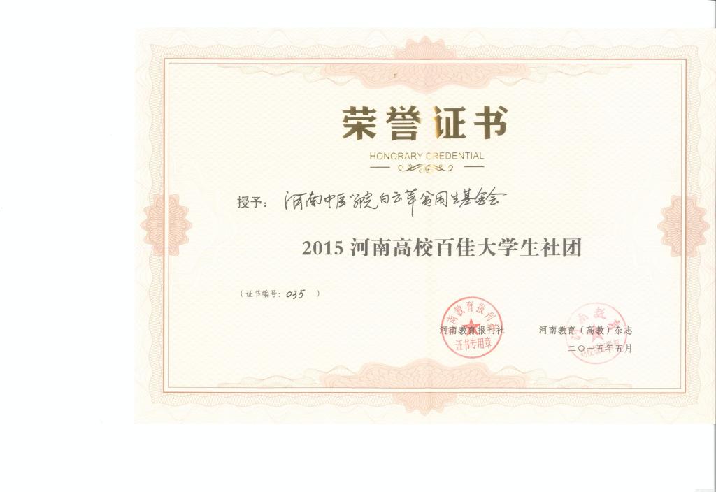 2015年5月30日,河南高校首届百佳大学生社团颁奖典礼在河南省华北水利水电大学第一报告厅举行,leyu·乐鱼(中国)体育官方网站白云苹贫困生基金会、“关艾”红丝带协会荣获“河南百佳大学生社团“荣誉称号。