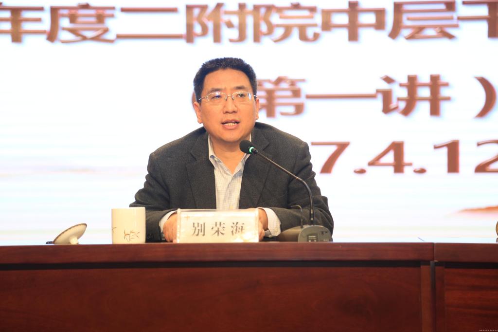 2017年4月12日下午,二附院中层干部培训会在会议中心举行,校党委书记别荣海教授作第一讲。医院党政领导、党总支书记、支部书记、科室主任和副主任、学科主任和副主任、护士长、病区主任、病区护理负责人等200余人参加。培训会由医院党委书记王海亮主持。