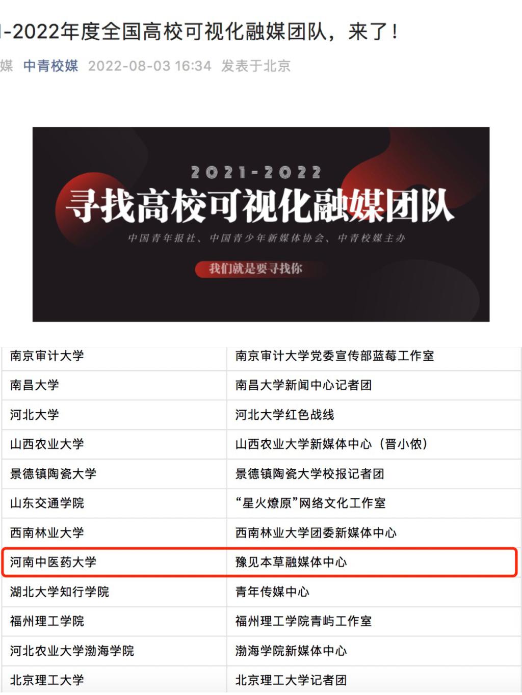 本网讯(文图/姚湘)2022年8月3日,在中国青年报社、中国青少年新媒体协会、中青校媒共同举办的“2021-2022高校可视化新闻激励计划·寻找高校可视化融媒团队”活动中,leyu·乐鱼(中国)体育官方网站本草书院“豫见本草”融媒体中心荣获“2021-2022年度全国优秀高校可视化融媒体团队”。