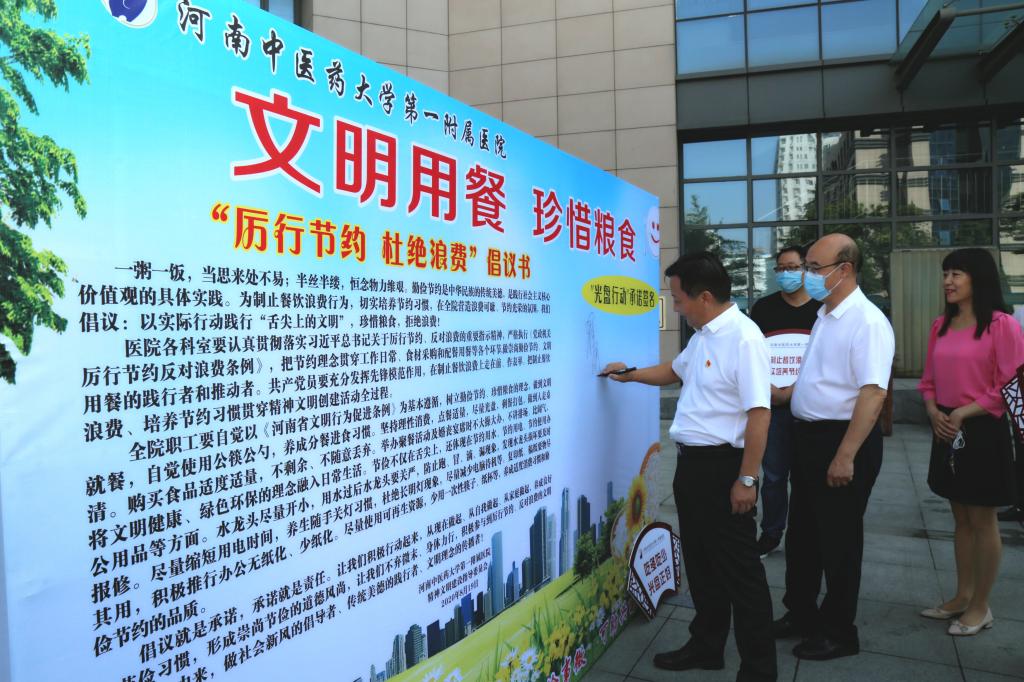 本网讯(文/图 冯超)2020年8月26日,一附院举办“厉行节约 杜绝浪费”倡议活动暨“光盘行动”承诺签名仪式。该活动旨在深入贯彻习近平总书记对制止餐饮浪费行为作出的的重要指示,切实培养节约习惯,在全社会营造浪费可耻、节约为荣的良好风尚。医院党委书记翟剑波,党委副书记、纪委书记段其波,副院长蒋士卿,各党总支党员、职工和志愿者代表参加了活动。