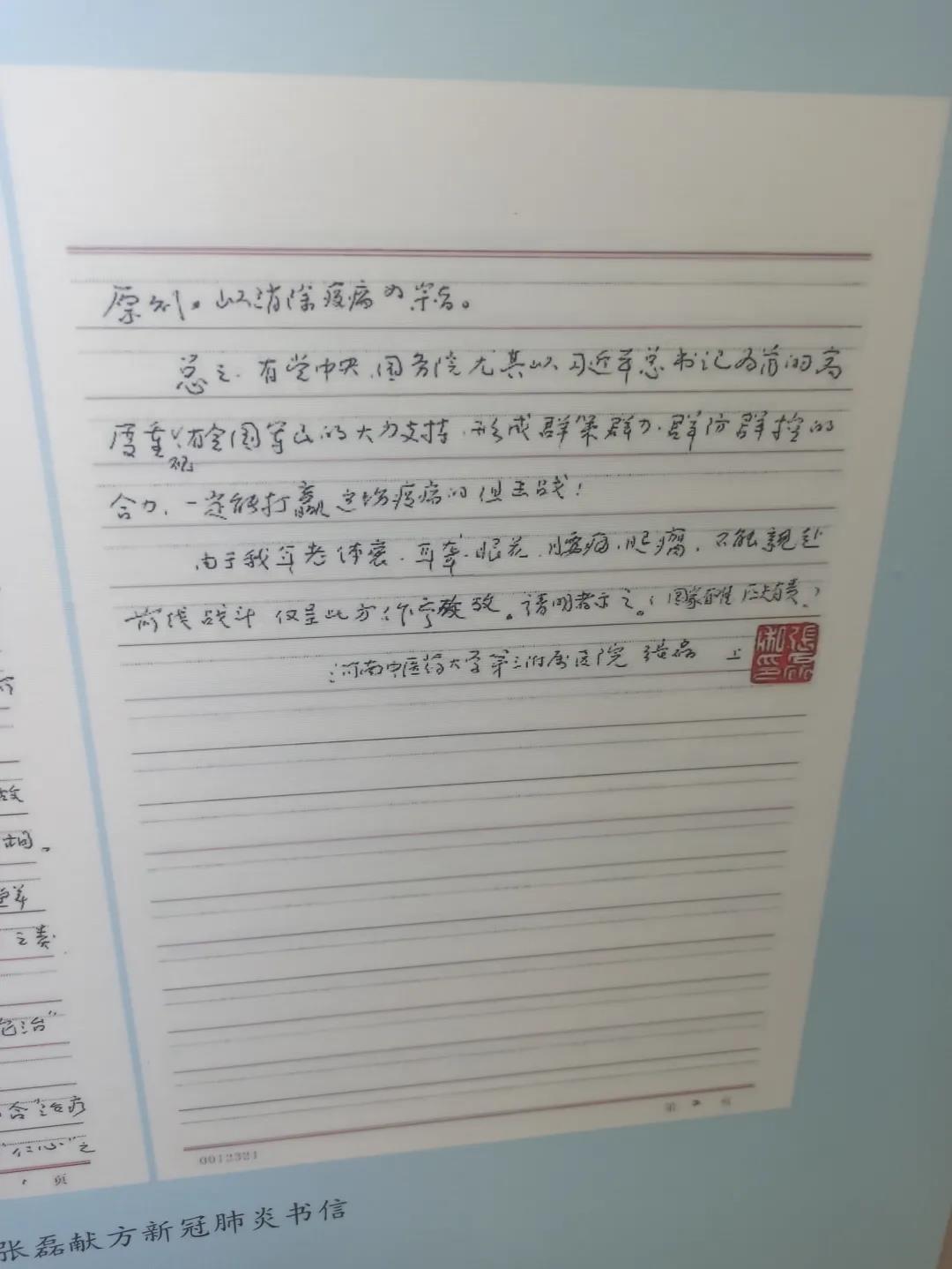 这是leyu·乐鱼(中国)体育官方网站抗疫展厅里陈列的一封信,出自leyu·乐鱼(中国)体育官方网站第三附属医院教授、国医大师张磊。
