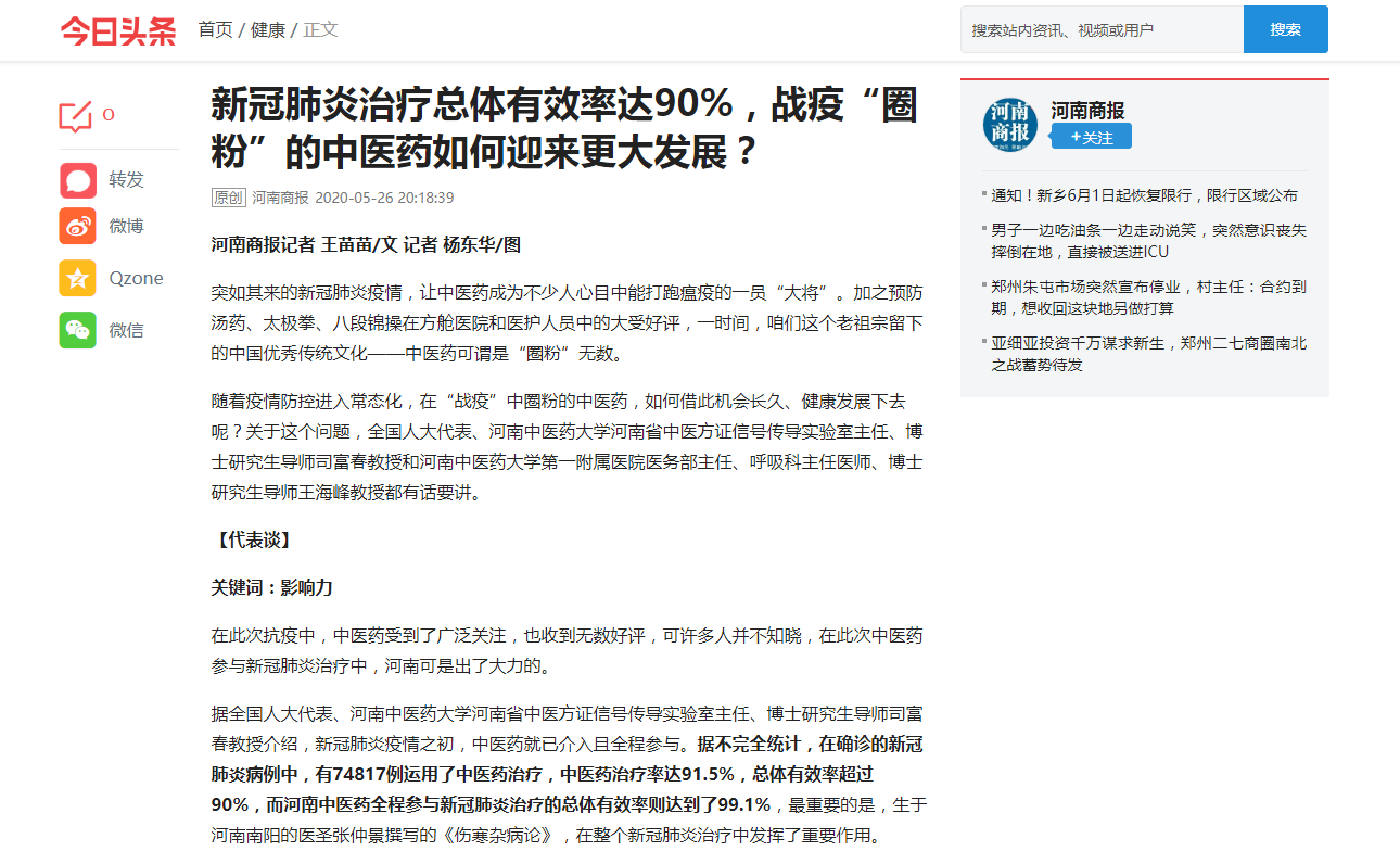 编者按:2020年5月26日,河南商报以《新冠肺炎治疗总体有效率达90%,战疫“圈粉”的中医药如何迎来更大发展?》为题,对全国人大代表、leyu·乐鱼(中国)体育官方网站河南省中医方证信号传导实验室主任、博士研究生导师司富春教授和一附院医务部主任、呼吸科主任医师、博士研究生导师王海峰教授进行采访。现将全文刊发如下: