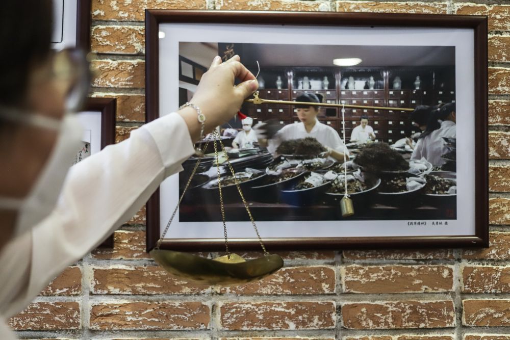 2020年11月14日,在巴西圣保罗,巴西中医药诊疗培训基地的工作人员展示称量中药的秤。在新冠肺炎疫情期间,该基地进行免费中医义诊服务,帮助民众防治新冠肺炎和其他疾病。