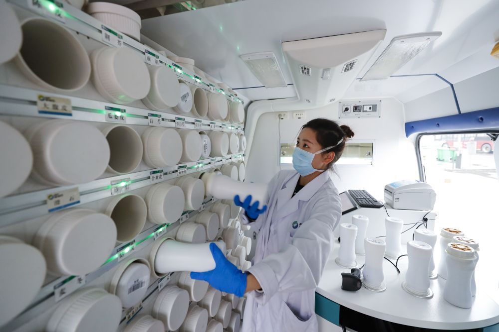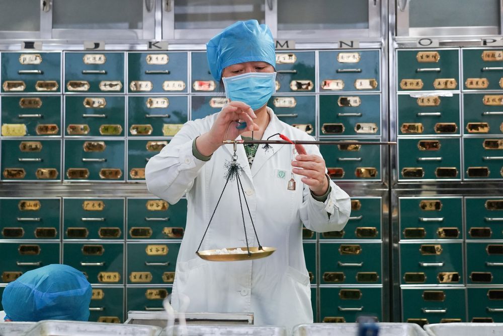 2020年2月15日,在北京地坛医院,药剂师在中药房为新冠肺炎患者配药。