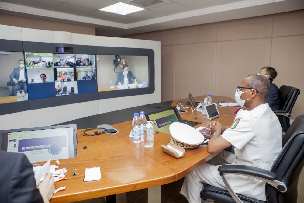 2020年4月10日,四川省卫生健康委员会、四川省外事办公室与中国驻科特迪瓦、乍得、刚果(金)和刚果(布)四国大使馆共同举办中非新冠肺炎疫情卫生专家视频会议。四川省医疗专家就新冠肺炎诊断和临床治疗、中医参与抗疫经验等问题同非洲四国卫生专家展开交流。这是在科特迪瓦阿比让拍摄的视频会议现场。