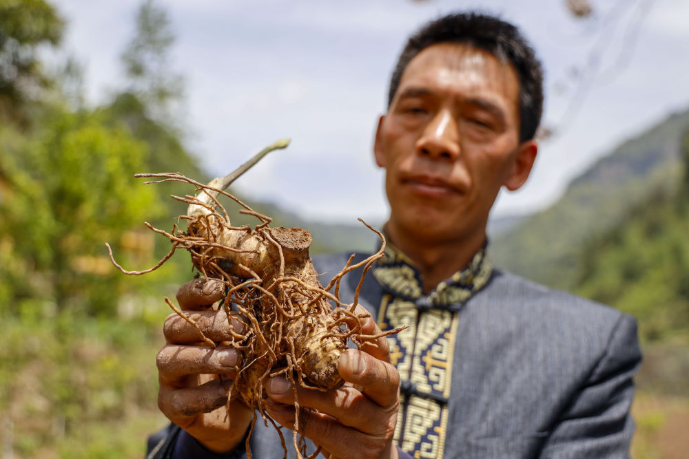 2019年4月16日,重庆石柱土家族自治县中益乡农民汪从兴展示种植的中药材黄精。