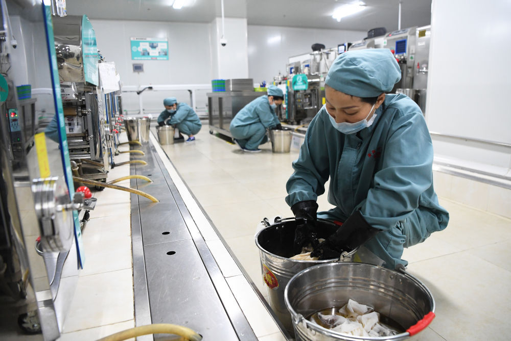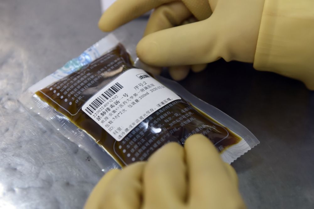 2020年2月24日,中药师在安徽中医药大学第一附属医院煎药室为煎好的中药汤剂贴标。