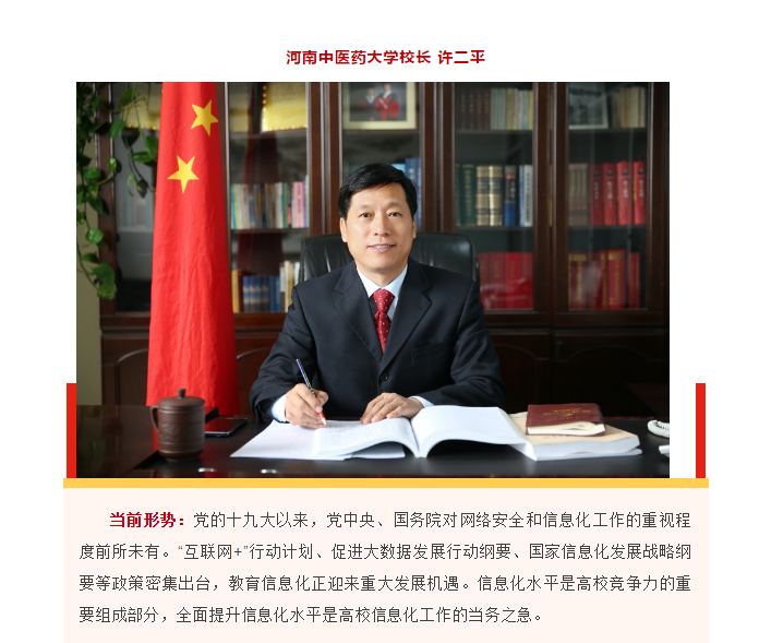 当前形势:党的十九大以来,党中央、国务院对网络安全和信息化工作的重视程度前所未有。“互联网+”行动计划、促进大数据发展行动纲要、国家信息化发展战略纲要等政策密集出台,教育信息化正迎来重大发展机遇。信息化水平是高校竞争力的重要组成部分,全面提升信息化水平是高校信息化工作的当务之急。