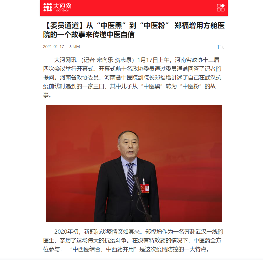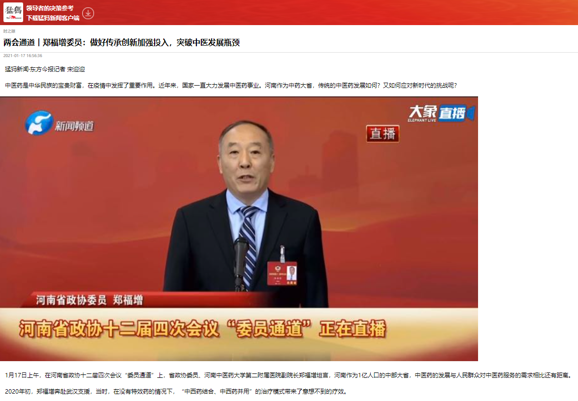编者按:2021年1月17日,大河网、猛犸新闻等媒体对河南省政协委员、leyu·乐鱼(中国)体育官方网站二附院副院长郑福增:做好传承创新加强投入,用方舱医院的一个故事来传递中医自信进行报道。