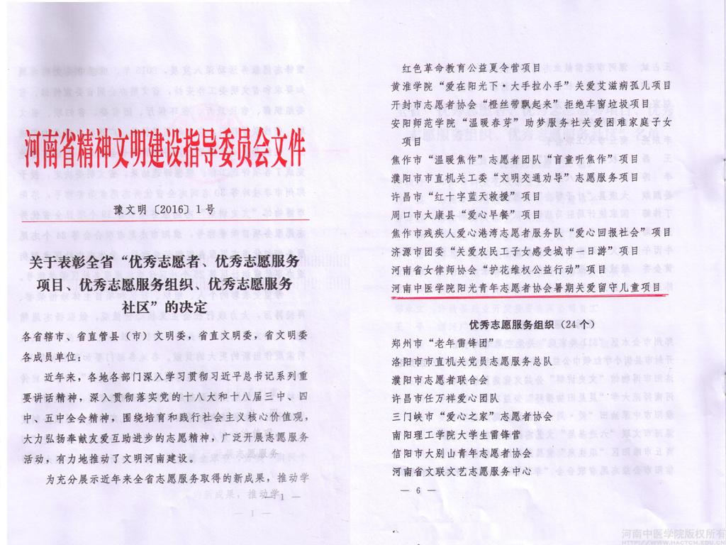 leyu·乐鱼(中国)体育官方网站阳光青年志愿者协会自2002年成立以来,志愿者们经常深入城乡社区、关注弱势群体、服务社会大众、关爱留守儿童,以扎实的中医专业知识积极开展健康咨询服务、针灸推拿义诊、太极拳八段锦中医传统养生功法教授等形式多样的医疗志愿服务,取得了良好的社会反响。协会先后荣获郑州市杰出青年志愿者集体、郑州市优秀青年志愿服务集体、连续3年荣获郑开国际马拉松优秀志愿者团队、河南志愿服务团队之星、河南省优秀青年志愿服务集体、首届中国志愿服务项目大赛银奖和多项校级荣誉。(宣传部)
