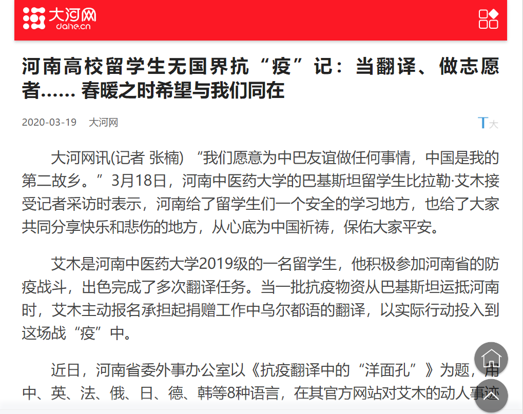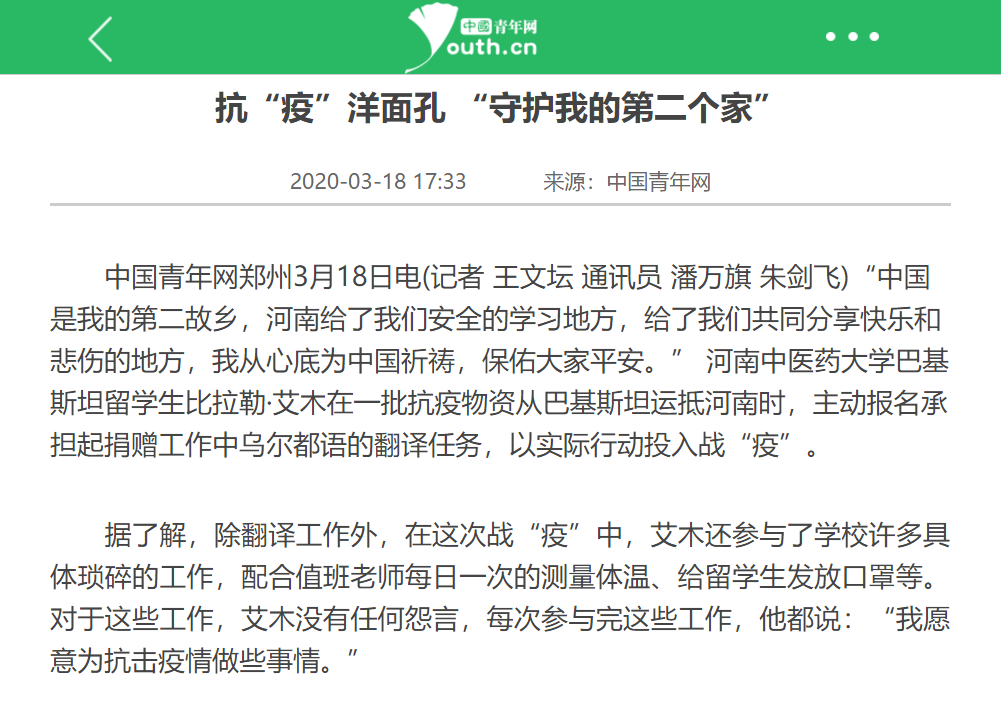 :2020年03月18日-19日,中青网、大河网对leyu·乐鱼(中国)体育官方网站巴基斯坦留学生比拉勒·艾木的抗疫事迹进行报道。