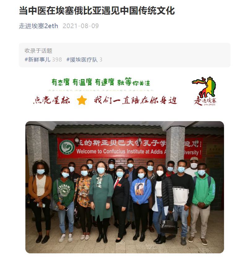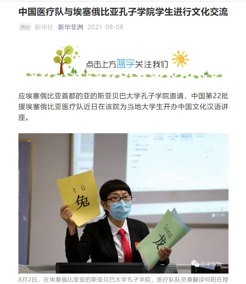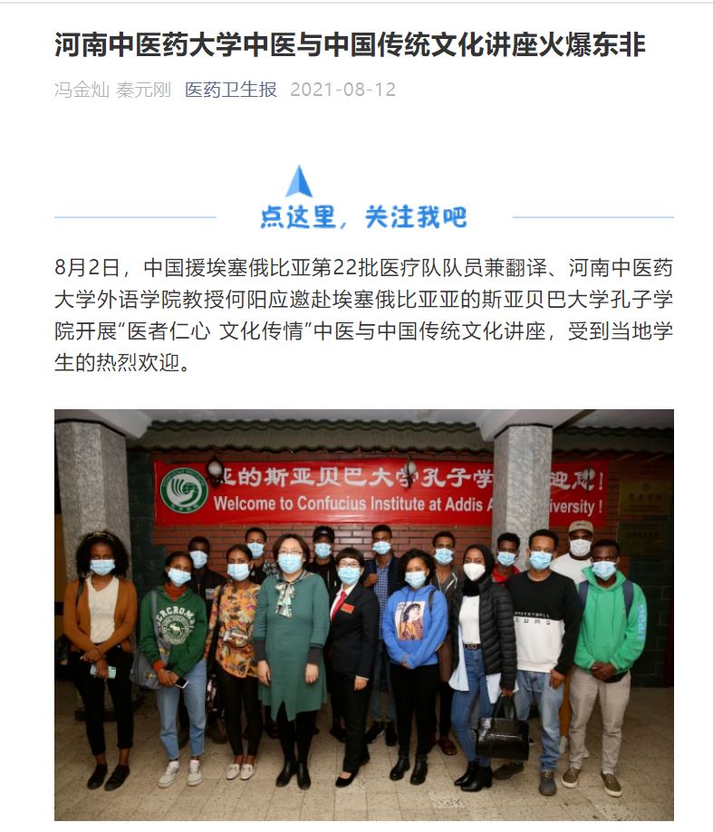 编者按:近日,新华网、新华非洲官方微信、医药卫生报等多家媒体对中国援埃塞俄比亚第22批医疗队队员兼翻译、leyu·乐鱼(中国)体育官方网站外语学院教授何阳应邀赴埃塞俄比亚亚的斯亚贝巴大学孔子学院开展“医者仁心 文化传情”中医与中国传统文化讲座进行报道。