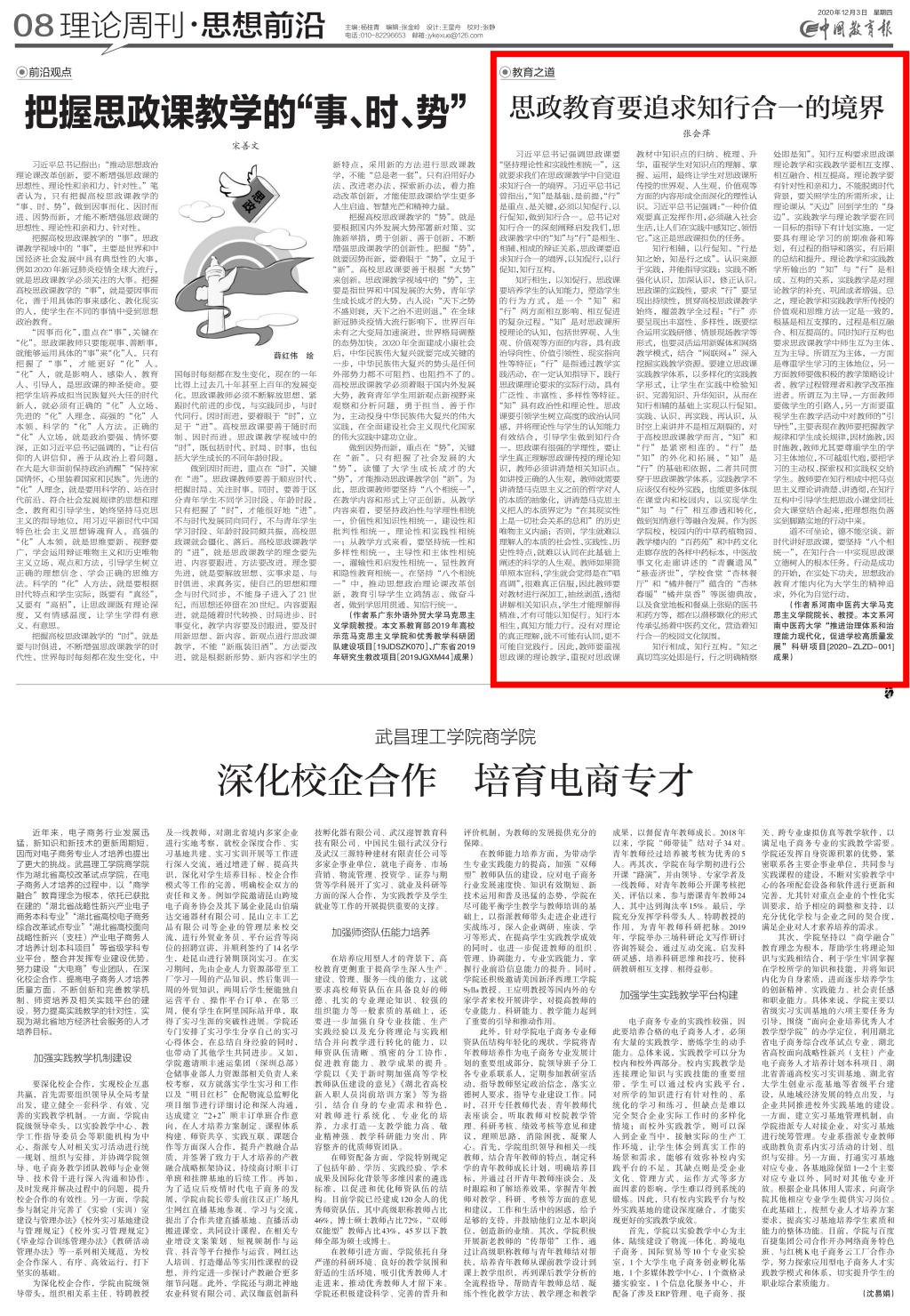 编者按:2020年12月3日,学习强国、中国教育报、中国教育网、中国纪检监察报分别刊发leyu·乐鱼(中国)体育官方网站马克思主义学院院长张会萍教授的理论文章《思政教育要追求知行合一的境界》《构筑不想腐的家庭防线》。现将两篇文章全文分别刊发如下: