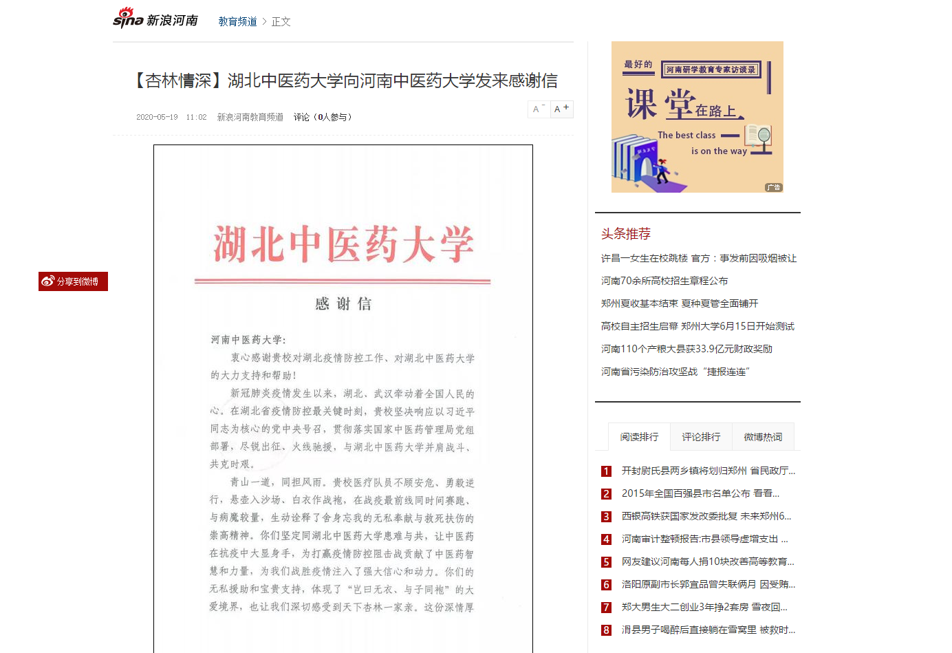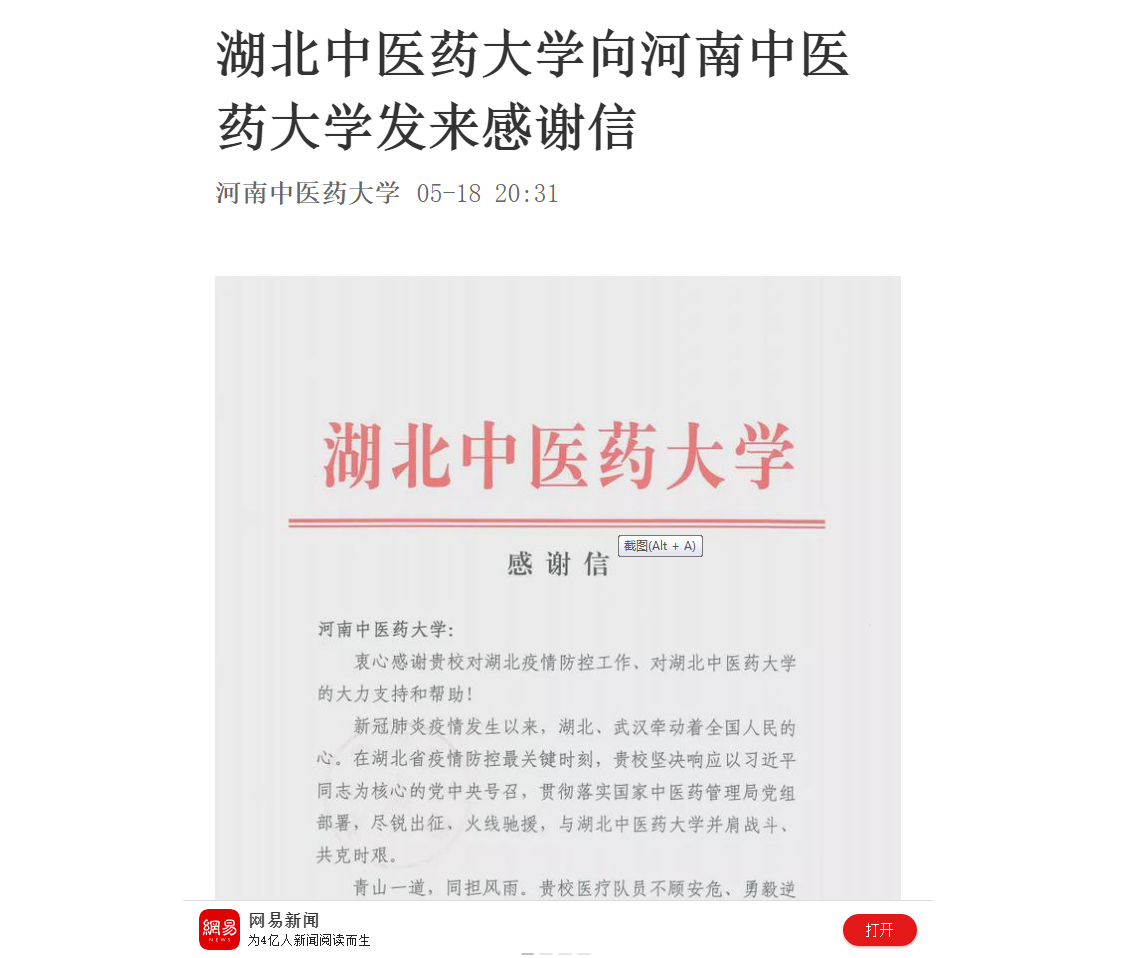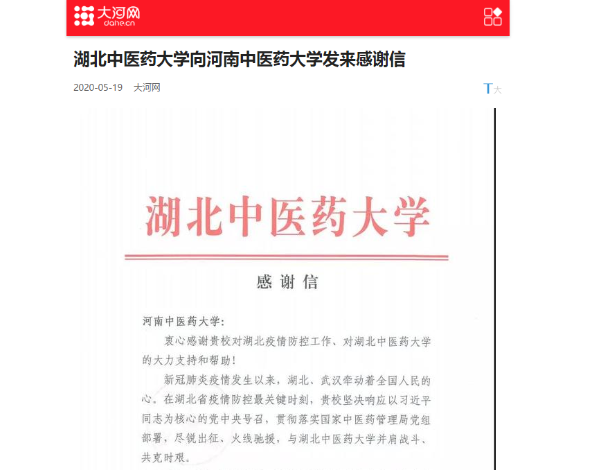 2020年5月19日,大河网、新浪新闻、网易新闻等媒体对湖北中医药大学向leyu·乐鱼(中国)体育官方网站发来感谢信进行报道。