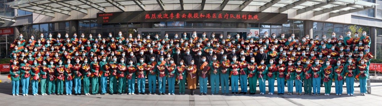 全体领导与队员们合影留念,久别重逢的科室同事们簇拥着凯旋的英雄热情问候、紧紧相拥,大家纷纷合影留念,记录这胜利团聚的一刻。