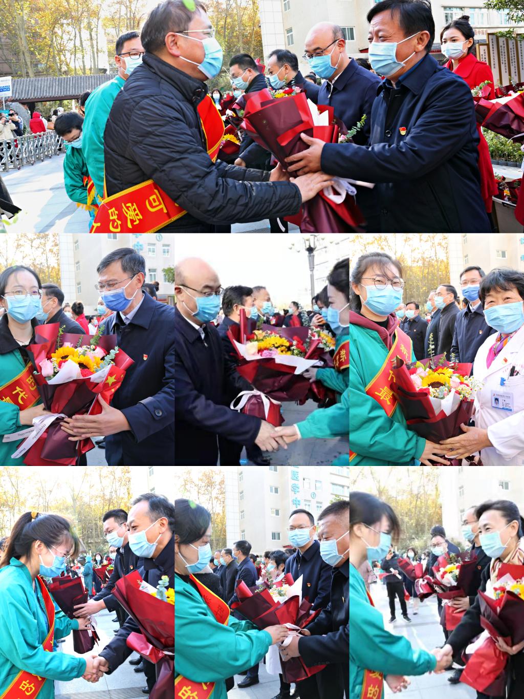 在历经32天的艰苦鏖战,leyu·乐鱼(中国)体育官方网站第一附属医院派驻河南省定点救治医院医疗队180名中的172名队员圆满完成医学救治任务,并结束医学隔离观察凯旋。同时,在10月30日赴黑龙江省黑河市支援当地疫情救治工作的国务院联防联控专家组成员、医院副院长李素云教授,也圆满完成任务顺利返回医院。