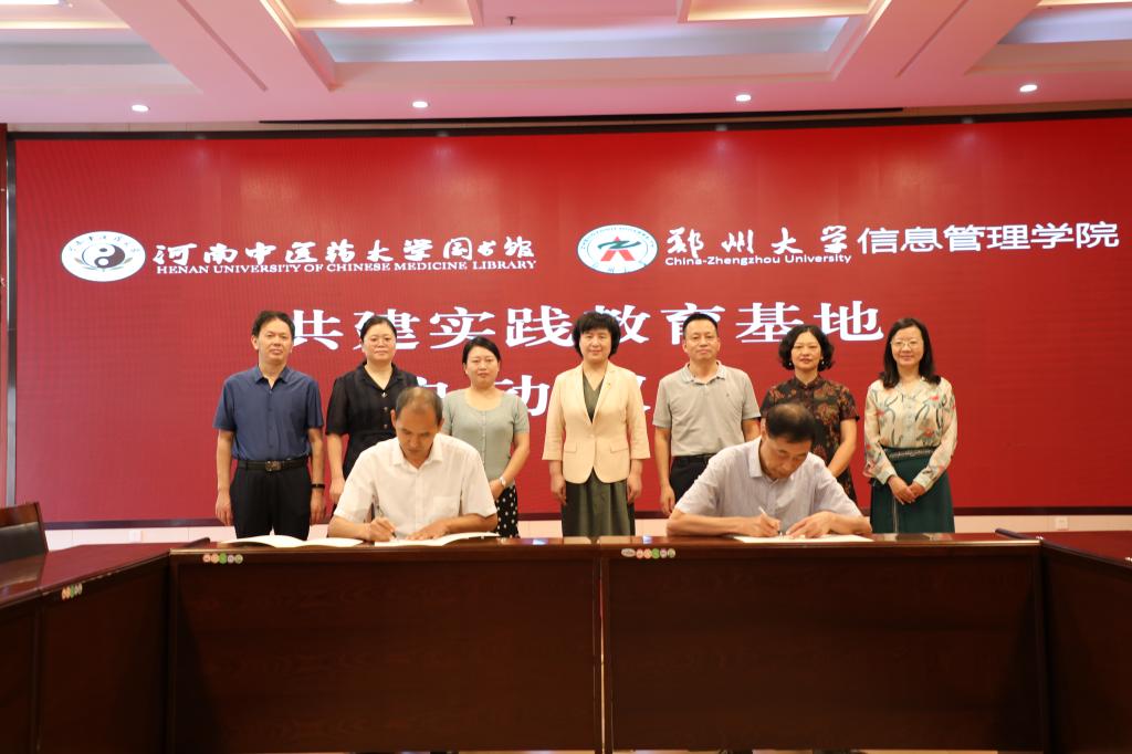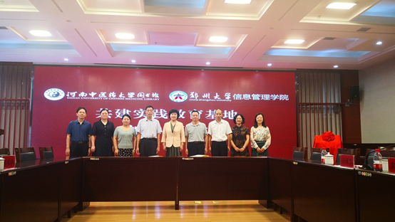 在郑州大学信息管理学院及leyu·乐鱼(中国)体育官方网站图书馆领导和教职工的共同见证下,臧国全和雷天锋签署了双方共建协议,并为“实践教育基地”揭牌。