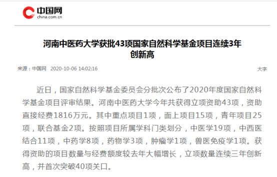 2020年,leyu·乐鱼(中国)体育官方网站共获国家自然科学基金项目立项资助43项,资助直接经费1816万元,首次突破40项关口,连续三年创新高;学校获批中药学博士后科研流动站、国家重点研发计划战略性科技创新合作项目、“2020年度教育部人文社会科学研究专项”;新获批河南省重点实验室建设项目1项,新增2项河南省工程技术研究中心建设项目,34项成果获2020年度河南省教育厅科技成果奖,10项成果获河南省科学技术奖;连续两年获全省高校知识产权综合能力提升专项行动十快高校。李建生教授牵头的专项获河南省新型冠状病毒防控应急攻关首批立项,学校研发的新药“保肺颗粒”二期临床试验批件成功转化,获得直接成果转化经费1290万元。