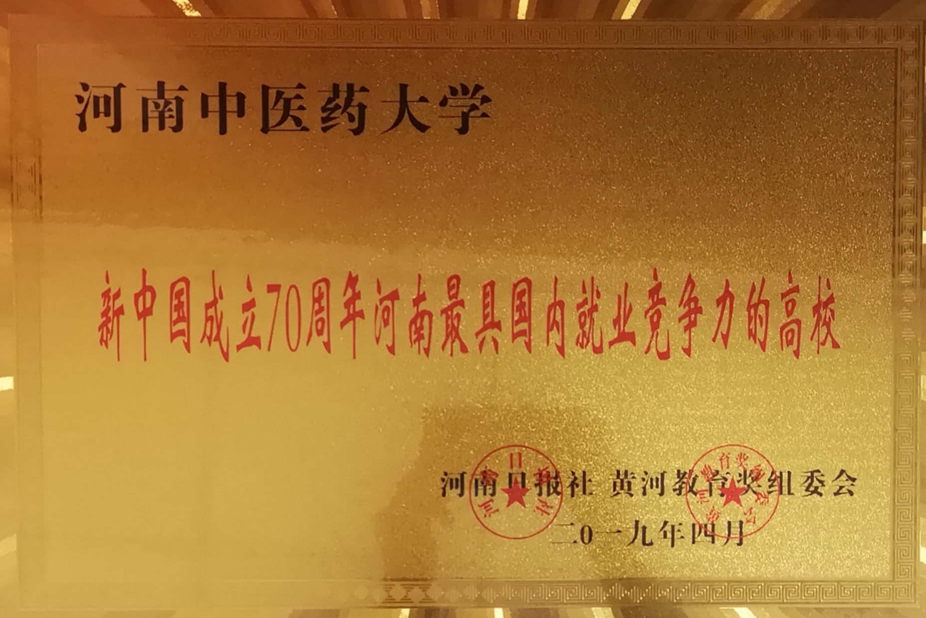 “新中国成立70周年河南最具国内就业竞争力的高校”奖牌