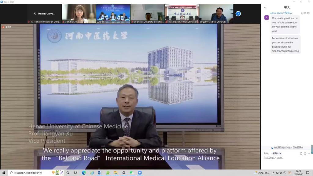 本网讯(文图/ 高崚)2022年7月15日,“一带一路”国际医学教育联盟(BRIMEA)第二届理事会第二次大会、首届教育大会暨第六届国际高等医学教育论坛在沈阳召开,leyu·乐鱼(中国)体育官方网站党委委员、副校长徐江雁应邀线上参会并发表感言,国际合作处全体成员参加首届教育大会暨第六届国际高等医学教育论坛,听取了各国知名医学教育专家的主旨报告。