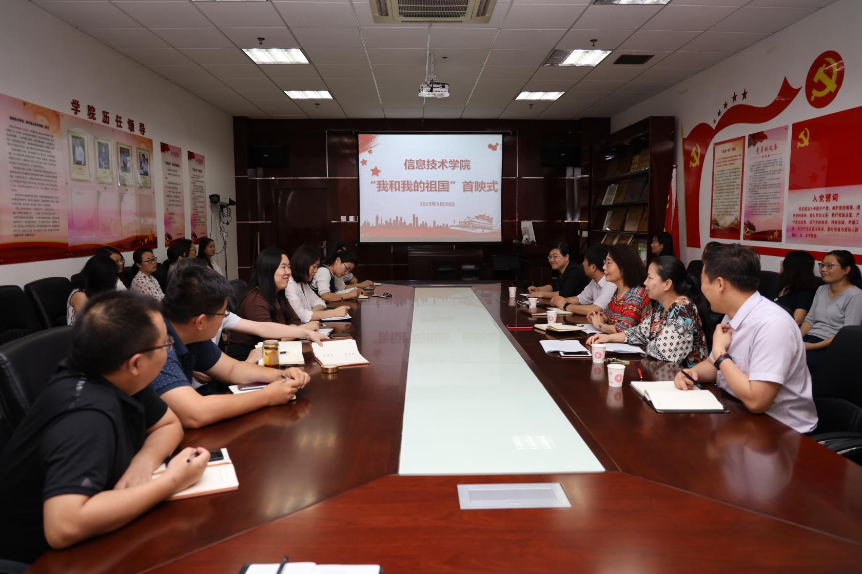 本网讯(文/李倩倩 图/秦东仁)为贯彻落实习近平总书记五四讲话精神,积极引导广大青年师生热爱伟大祖国,2019年5月28日下午,信息技术学院举办青春快闪视频《我和我的祖国》首映式。信息技术学院党委班子成员、全体教职工党员和学生党员代表参加活动。