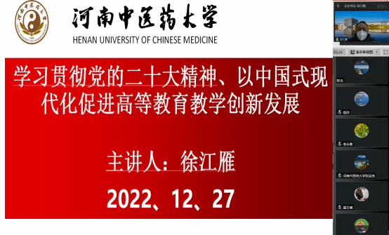 徐江雁从领悟党的二十大报告内涵、把握党的二十大报告新论断、践行党的二十大报告要求三大方面对党的二十大精神进行了系统的阐释,重点围绕“以中国式现代化促进高等教育教学创新发展”展开论述。徐江雁结合leyu·乐鱼(中国)体育官方网站教育教学现状,取得的成就和存在的差距,未来leyu·乐鱼(中国)体育官方网站将聚焦人才培养,建好金专、金师和金教材等方面抓好根本质量;破解“卡脖子”“卡脑子”“卡嗓子”问题抓好服务质量;打造高等教育教学发展的“中国范式”等,强调要多方面加快推进新学科创新发展,走好河南中医药人才培养的特色之路,实现河南省中医药高等教育的高质量发展。