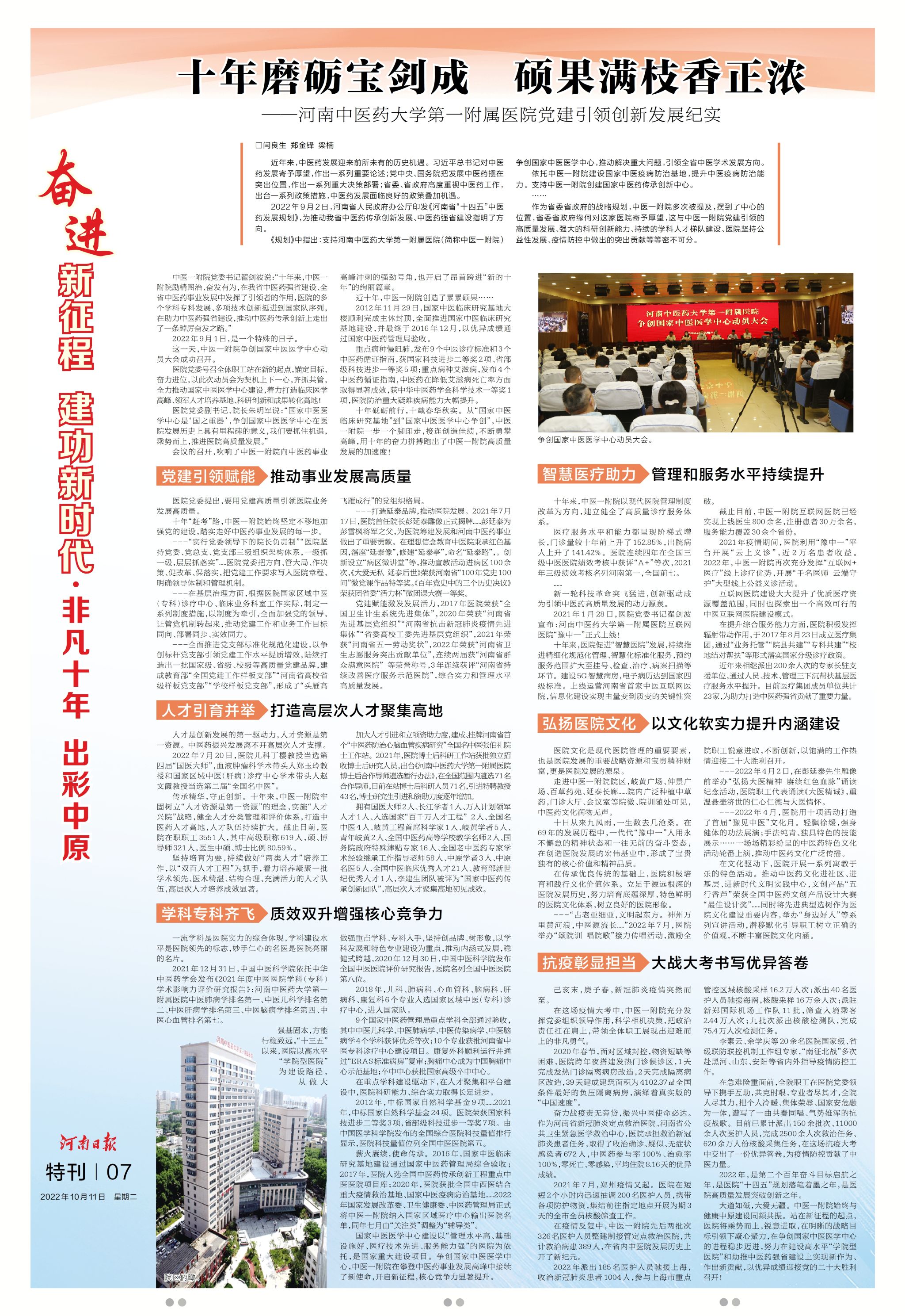 编者按:十年励精图治,十年踔厉奋发,leyu·乐鱼(中国)体育官方网站第一附属医院以党建引领创新发展,取得累累硕果。2022年10月11日,河南日报、顶端新闻、今日头条等媒体以“十年磨砺宝剑成 硕果满枝香正浓”为题,对一附院十年发展进行报道,现将全文刊发如下: