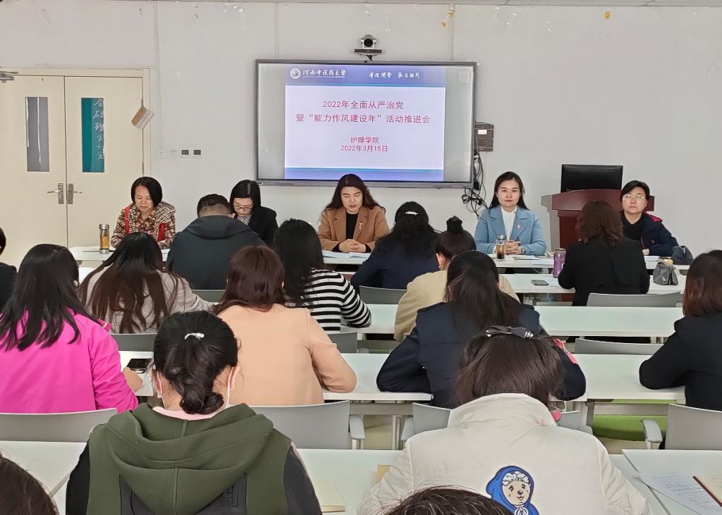 本网讯(文/周天睿 图/张璟)为进一步推进全面从严治党工作向纵深发展,强化广大党员干部能力作风建设,护理学院于2022年3月15日下午在实训楼1017会议室召开全面从严治党暨“能力作风建设年”活动推进会。校党委委员、副校长田力在线参会,护理学院全体教职工参加会议,会议由副院长秦元梅主持。