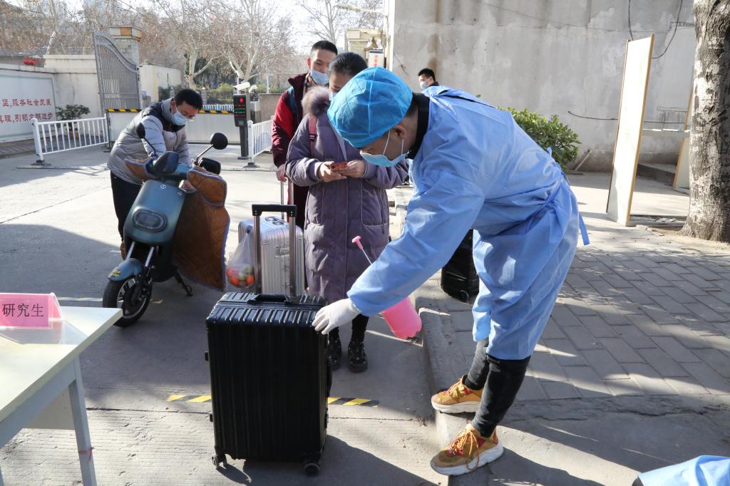 工作人员为返校研究生进行行李消杀