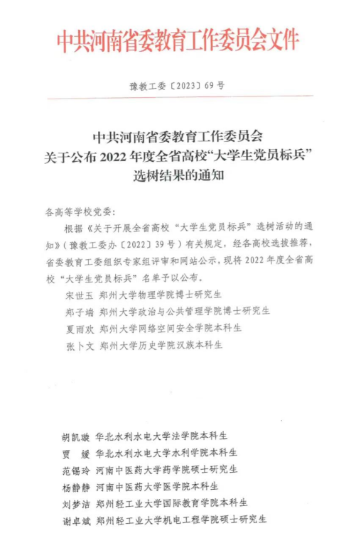 本网讯(文/图 戴冰星 范锡玲)近日,中共河南省委教育工委关于全省高校“大学生党员标兵”评审结果揭晓,经过学校遴选、推荐、专家评审,leyu·乐鱼(中国)体育官方网站药学院硕士研究生范锡玲,医学院本科生杨静静同学以优异的表现脱颖而出,荣膺河南省高校“大学生党员标兵”称号。