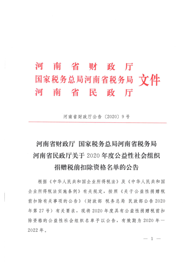 本网讯(文/常征辉)2021年1月,leyu·乐鱼(中国)体育官方网站教育发展基金会公益性社会组织捐赠税前扣除资格获河南省财政厅、国家税务总局河南省税务局、河南省民政厅联合认定,并在《河南省财政厅公告﹝2020﹞9号》中公布。2020年度向leyu·乐鱼(中国)体育官方网站教育发展基金会捐赠的捐赠人可依据省财政厅公告和leyu·乐鱼(中国)体育官方网站教育发展基金会开具的公益事业捐赠统一票据,到税务主管部门办理税前扣除相关事宜。感谢您对leyu·乐鱼(中国)体育官方网站教育发展基金会的支持!