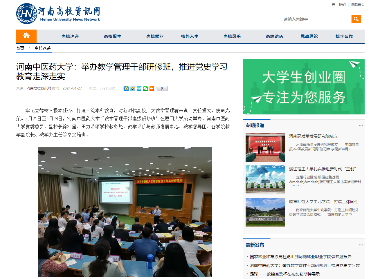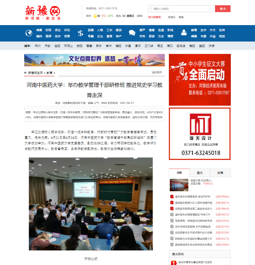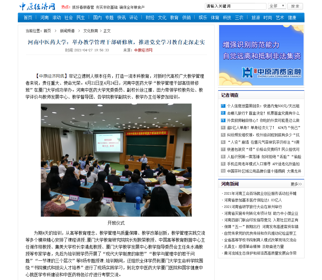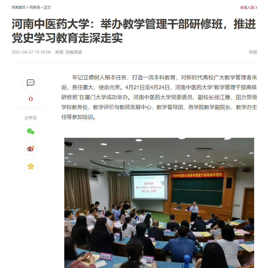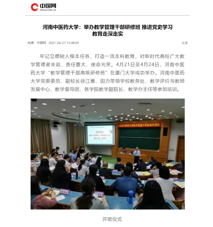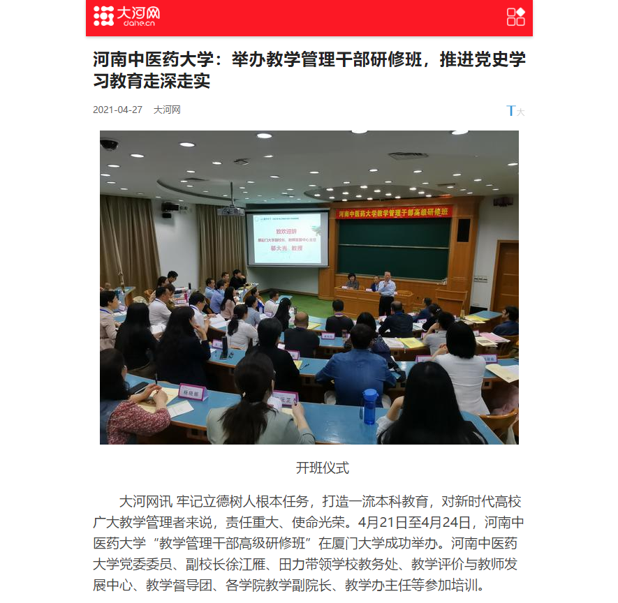 编者按:2021年4月27日,中国网、中华高校网、大河网、河南高校资讯网、网易新闻、新豫网、中原经济网等多家媒体对leyu·乐鱼(中国)体育官方网站举办教学管理干部研修班,推进党史学习教育走深走实进行报道。