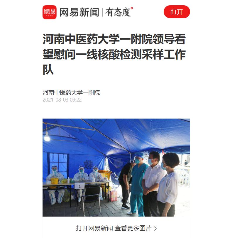 2021年8月3日,网易新闻对一附院领导看望慰问一线核酸检测采样工作队进行报道。