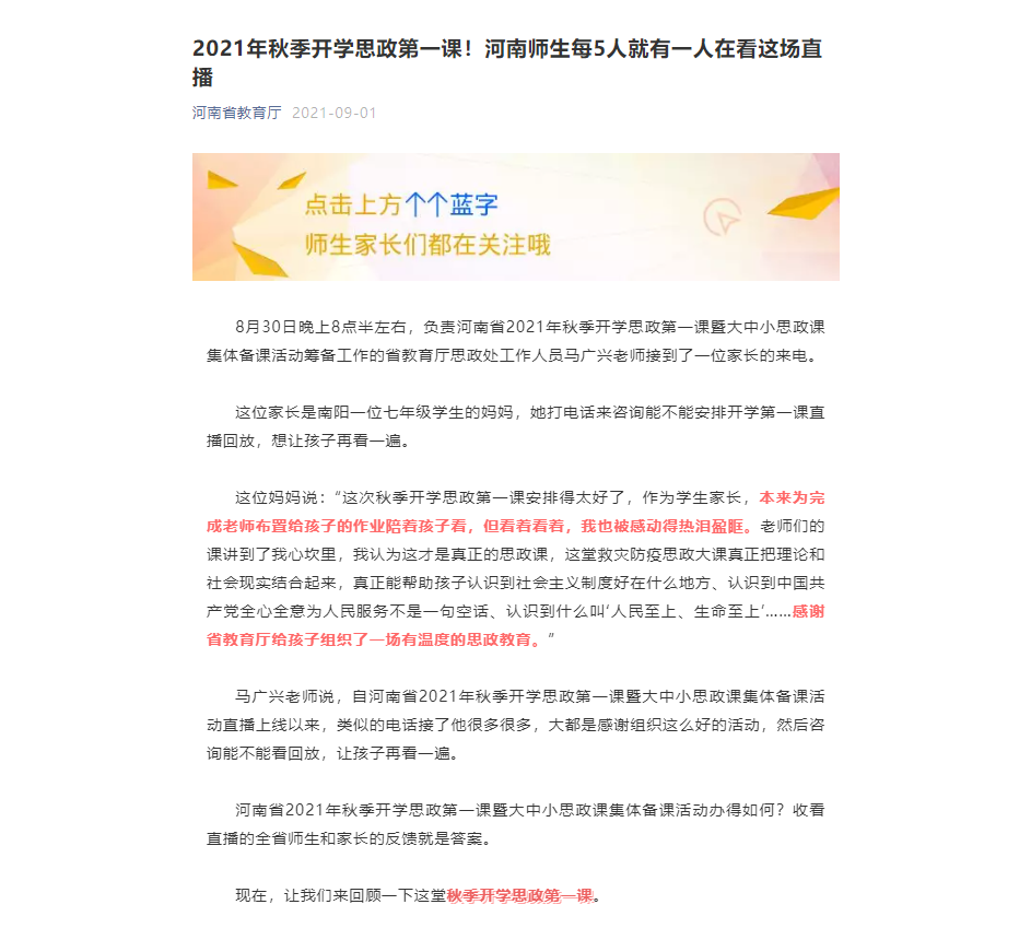 河南省2021年秋季开学思政第一课暨大中小思政课集体备课活动办得如何?收看直播的全省师生和家长的反馈就是答案。
