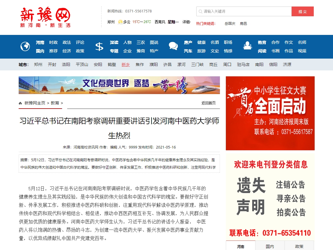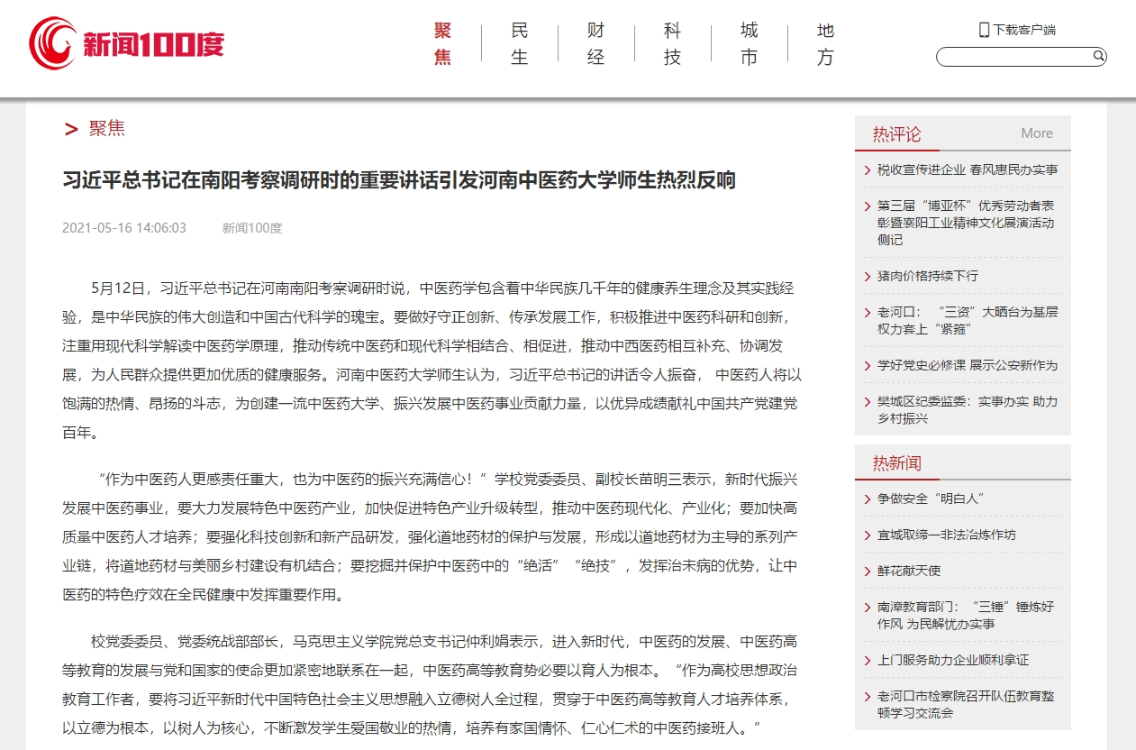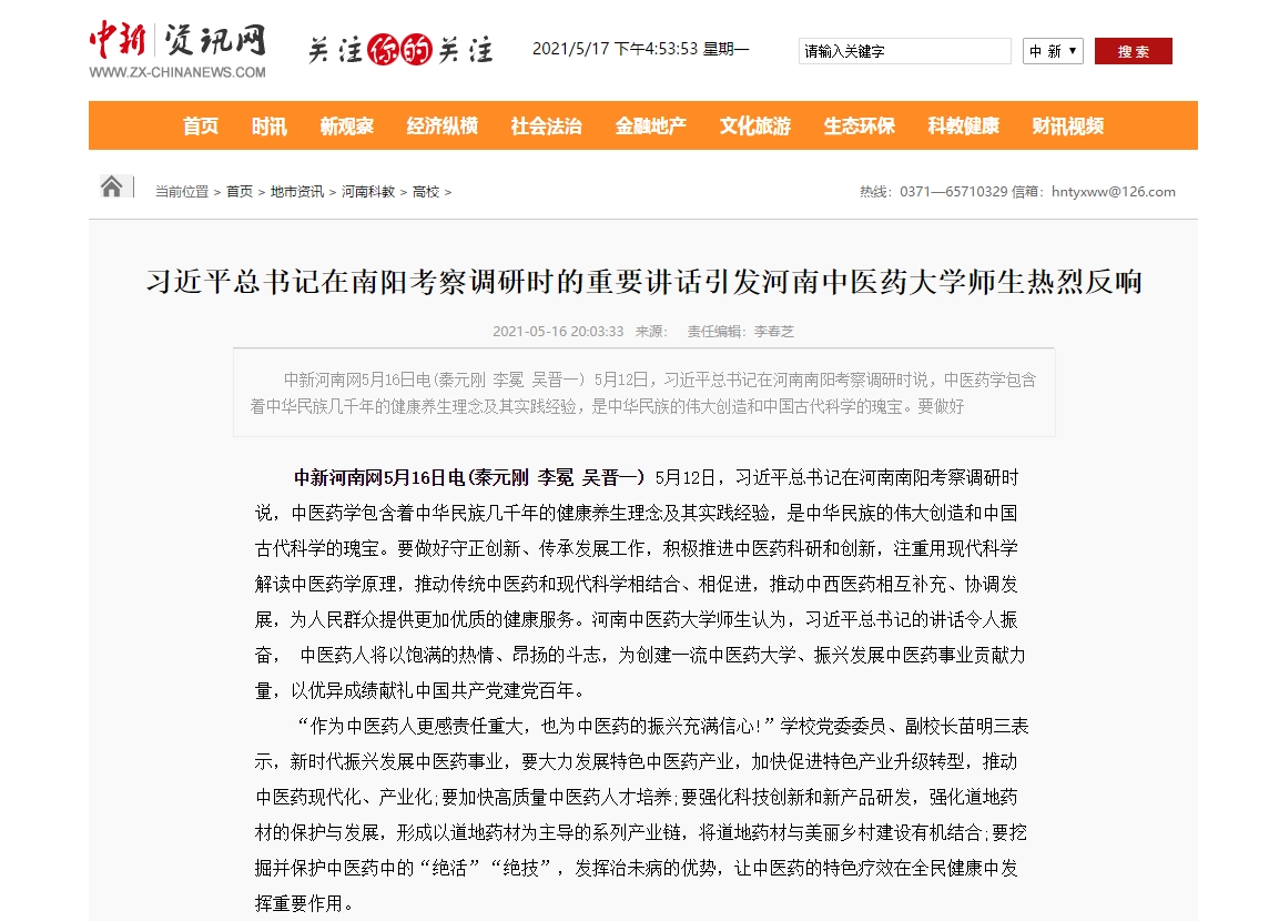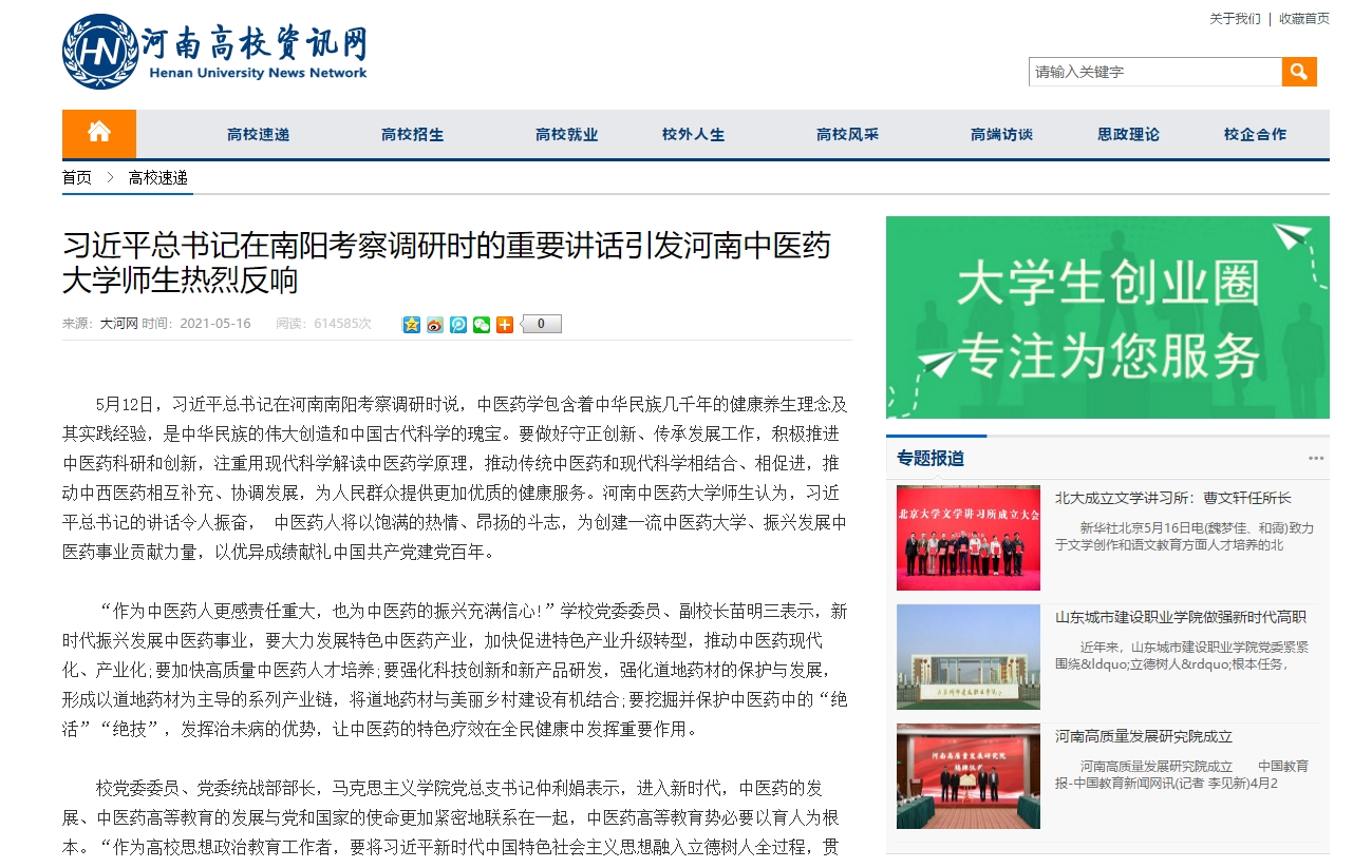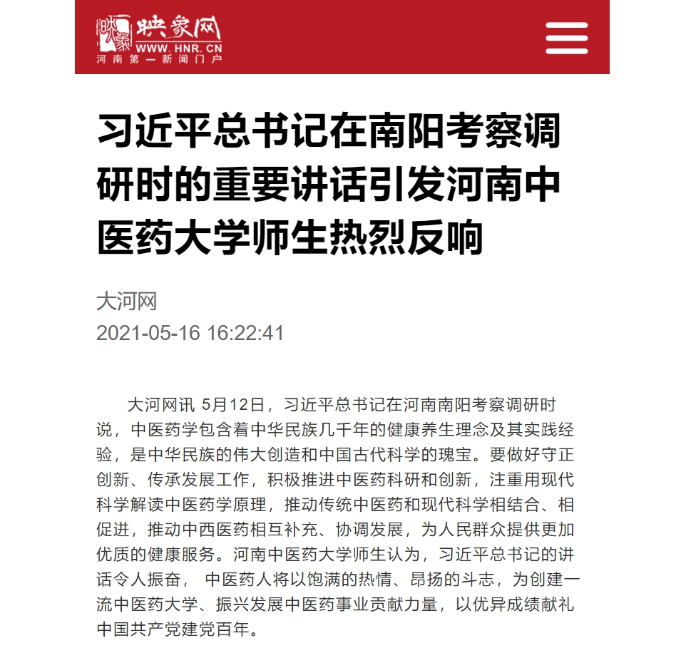 编者按:2021年5月15-17日,中华网、中华高校网、中新资讯网、中国医药新闻网、中国医学新闻网、中国产业新闻网、中国文化信息传播网、中国经济贸易新闻网、中国资源新闻网、中国企业经济网、大河网、河南高校资讯网、新豫网、河南经济论坛、映象新闻、中原网、法治与社会杂志、新闻100度、燕赵新闻网、智能高科新闻网、中关村经济发展网、中科信息创新网、旅游中国网、东方新闻等数十家媒体对习近平总书记在南阳考察调研时的重要讲话引发leyu·乐鱼(中国)体育官方网站师生热烈反响进行报道。