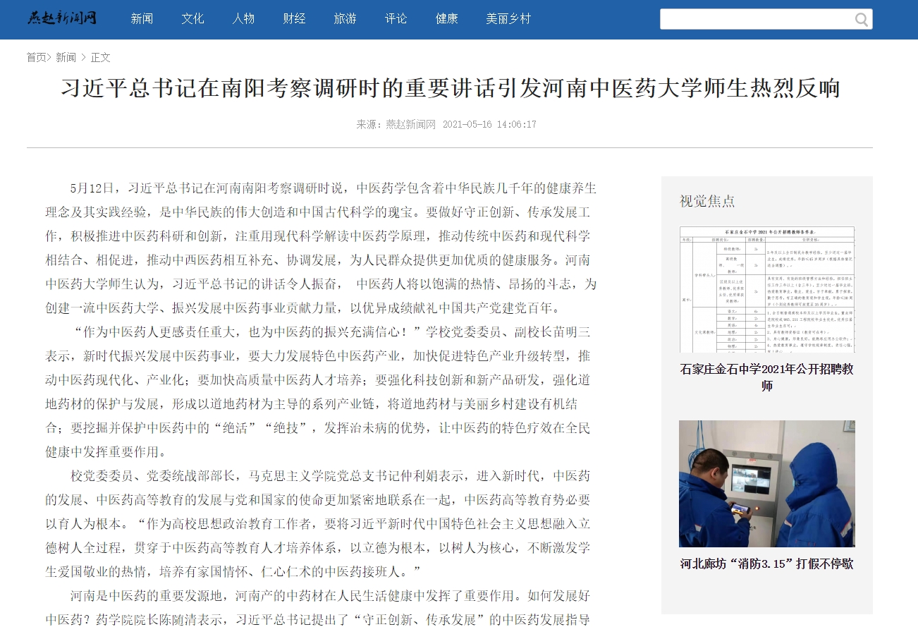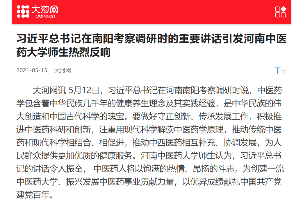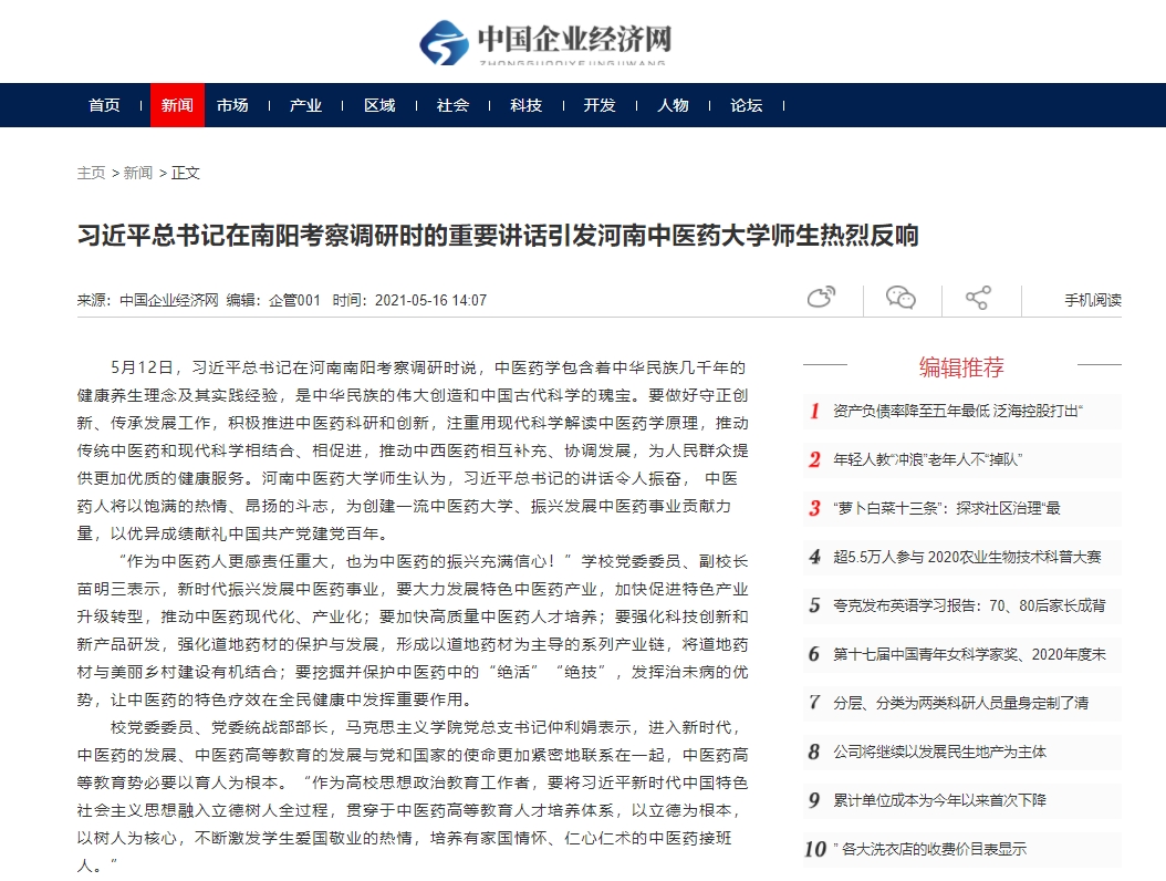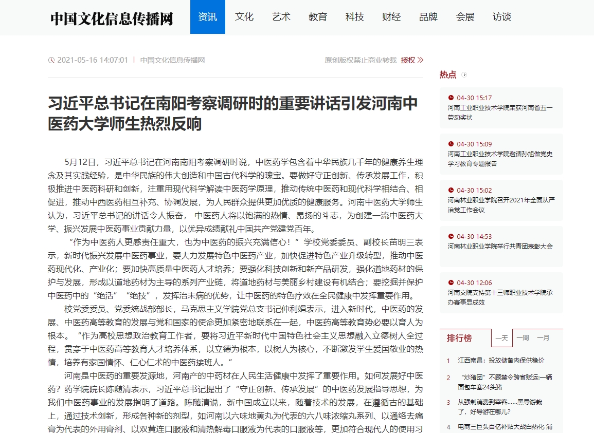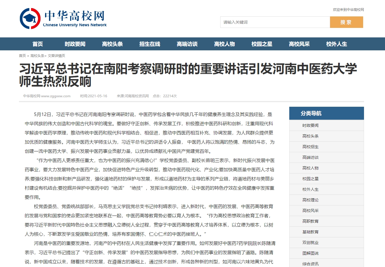 编者按:2021年5月15-17日,中华网、中华高校网、中新资讯网、中国医药新闻网、中国医学新闻网、中国产业新闻网、中国文化信息传播网、中国经济贸易新闻网、中国资源新闻网、中国企业经济网、大河网、河南高校资讯网、新豫网、河南经济论坛、映象新闻、中原网、法治与社会杂志、新闻100度、燕赵新闻网、智能高科新闻网、中关村经济发展网、中科信息创新网、旅游中国网、东方新闻等数十家媒体对习近平总书记在南阳考察调研时的重要讲话引发leyu·乐鱼(中国)体育官方网站师生热烈反响进行报道。