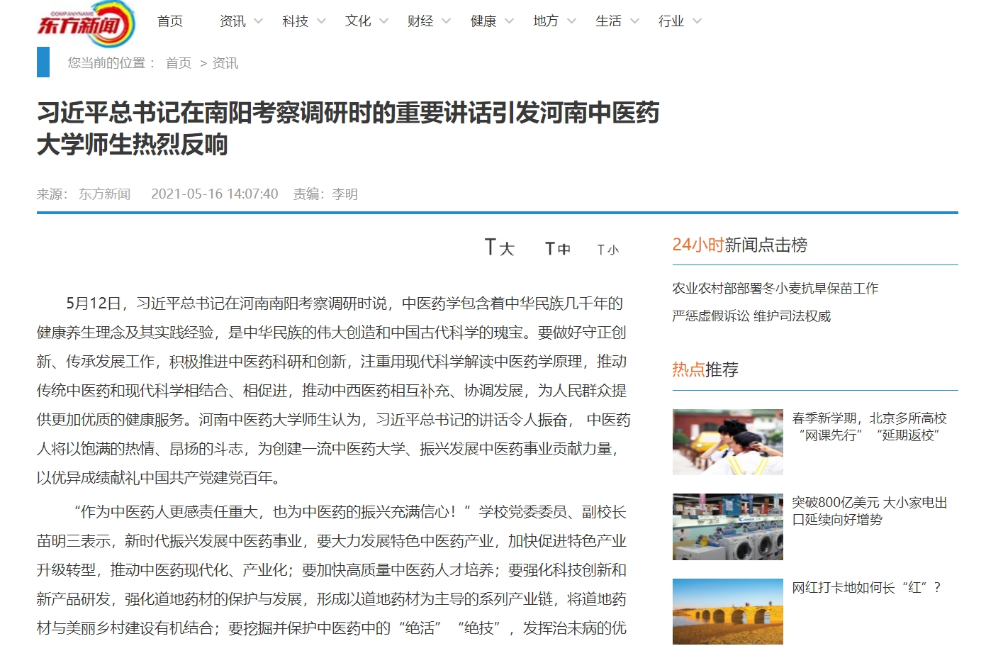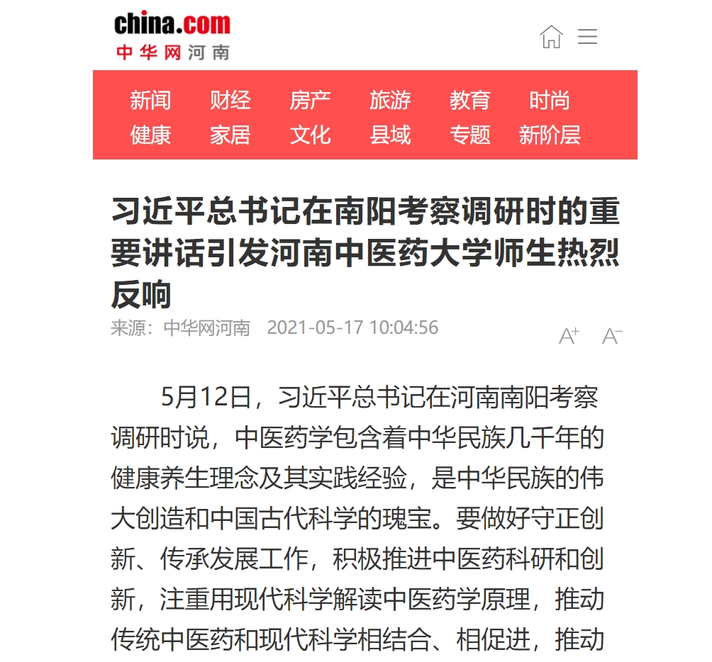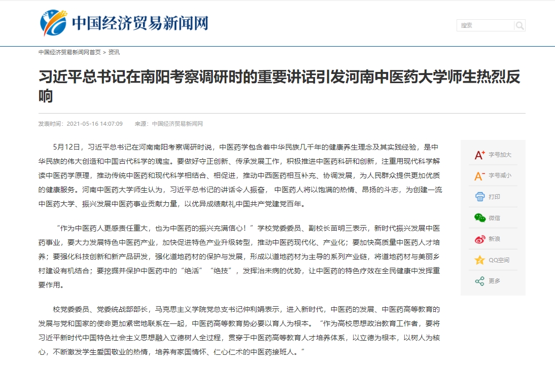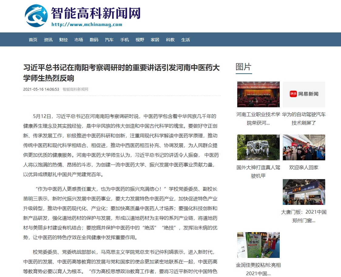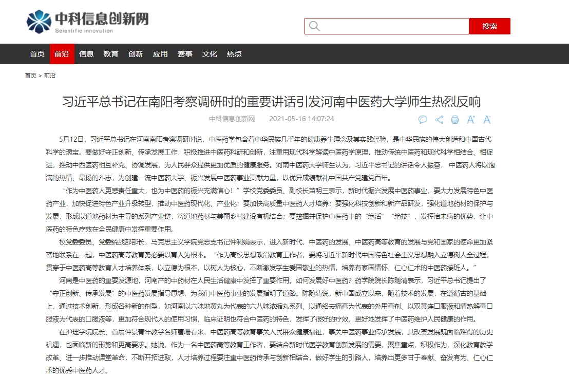 编者按:2021年5月15-17日,中华网、中华高校网、中新资讯网、中国医药新闻网、中国医学新闻网、中国产业新闻网、中国文化信息传播网、中国经济贸易新闻网、中国资源新闻网、中国企业经济网、大河网、河南高校资讯网、新豫网、河南经济论坛、映象新闻、中原网、法治与社会杂志、新闻100度、燕赵新闻网、智能高科新闻网、中关村经济发展网、中科信息创新网、旅游中国网、东方新闻等数十家媒体对习近平总书记在南阳考察调研时的重要讲话引发leyu·乐鱼(中国)体育官方网站师生热烈反响进行报道。