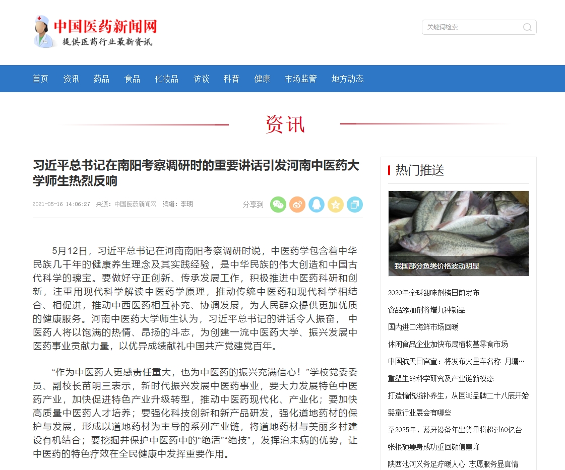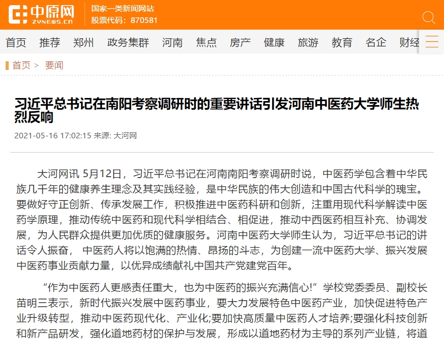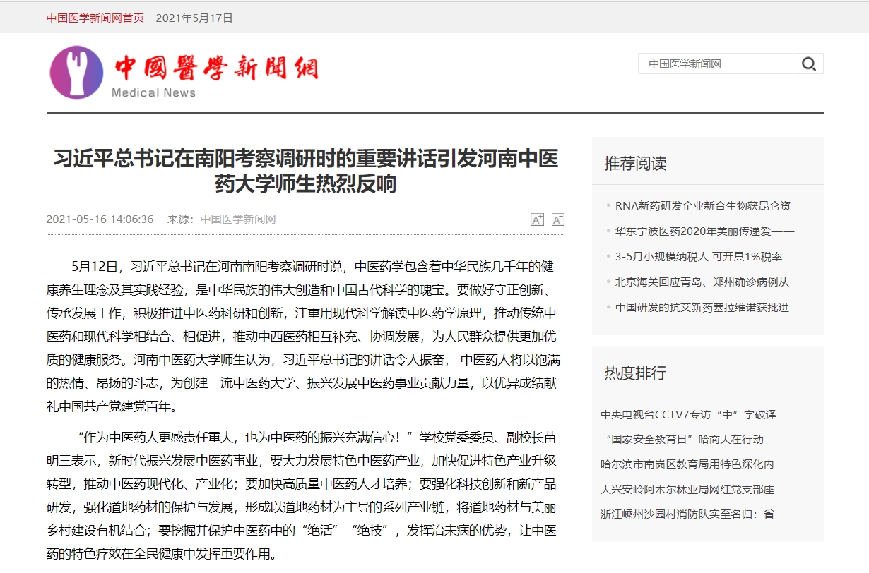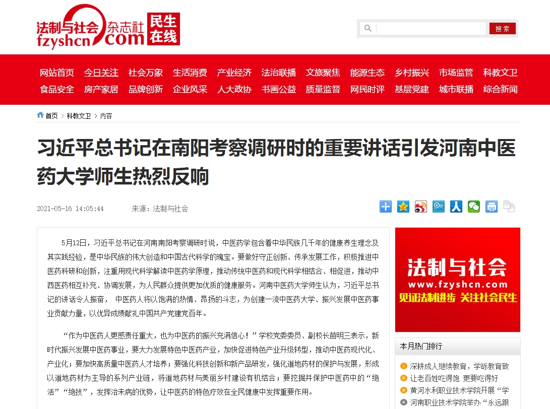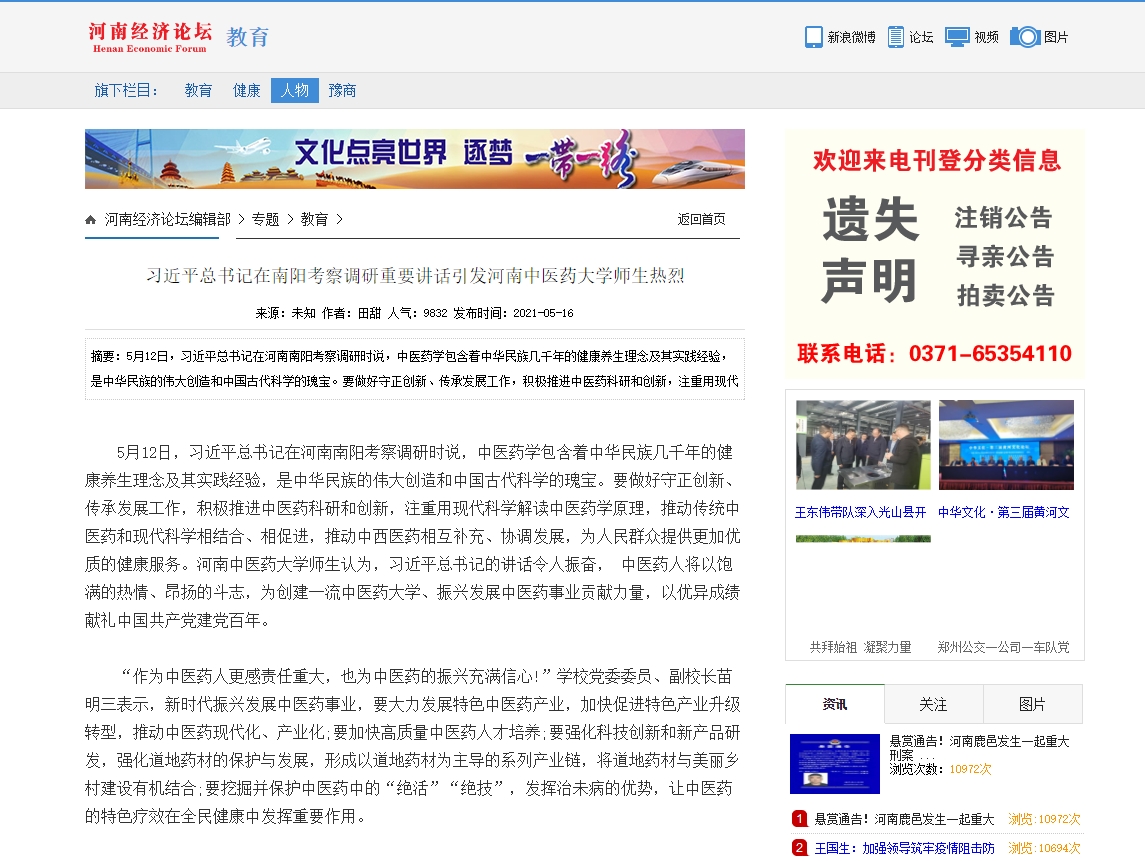 编者按:2021年5月15-17日,中华网、中华高校网、中新资讯网、中国医药新闻网、中国医学新闻网、中国产业新闻网、中国文化信息传播网、中国经济贸易新闻网、中国资源新闻网、中国企业经济网、大河网、河南高校资讯网、新豫网、河南经济论坛、映象新闻、中原网、法治与社会杂志、新闻100度、燕赵新闻网、智能高科新闻网、中关村经济发展网、中科信息创新网、旅游中国网、东方新闻等数十家媒体对习近平总书记在南阳考察调研时的重要讲话引发leyu·乐鱼(中国)体育官方网站师生热烈反响进行报道。