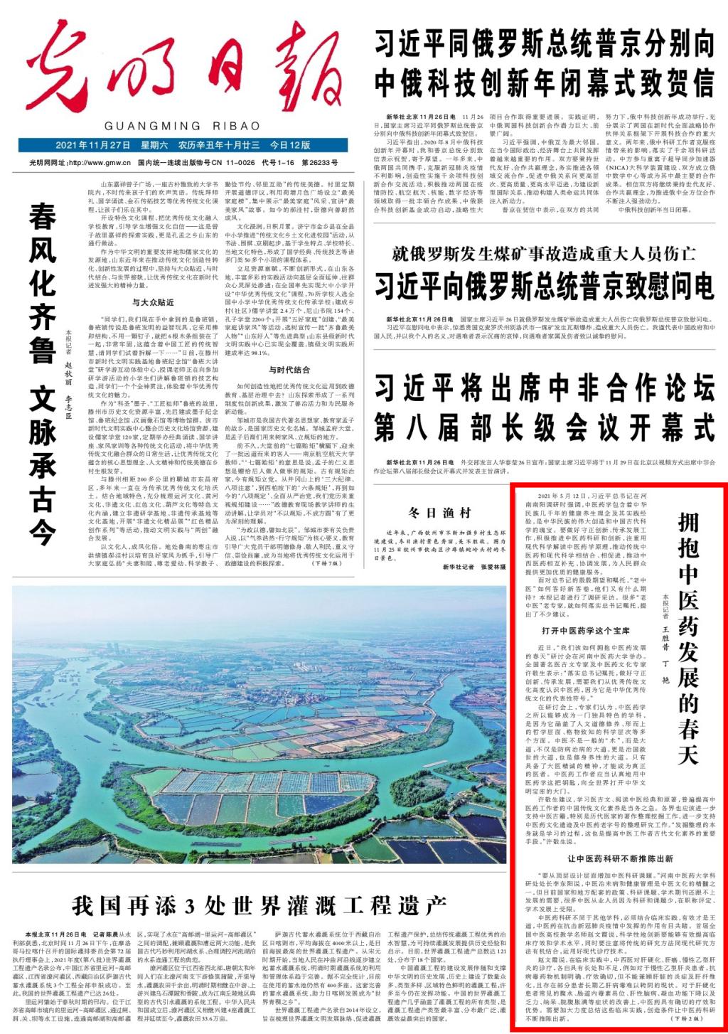 2021年11月27日,光明日报头版对leyu·乐鱼(中国)体育官方网站“我们该如何拥抱中医药发展的春天——习近平总书记对中医药工作的重要指示精神学习研讨会”进行报道。