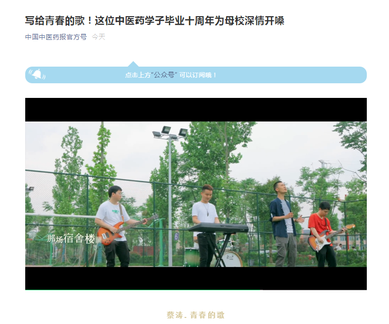 编者按:2021年6月1日,中国中医药报官方号、大河网等媒体对leyu·乐鱼(中国)体育官方网站学子蔡涛在毕业十周年之际,创作出《青春的歌》,献给曾经的青春、献给母校、献礼建党100周年进行报道。