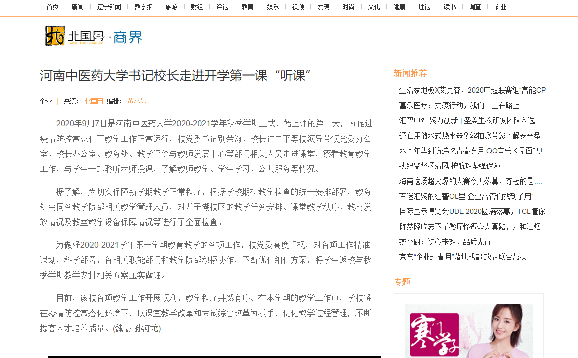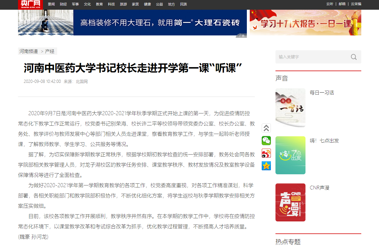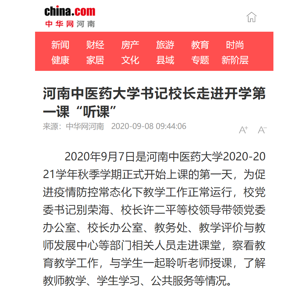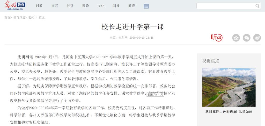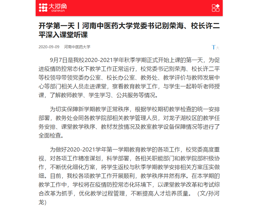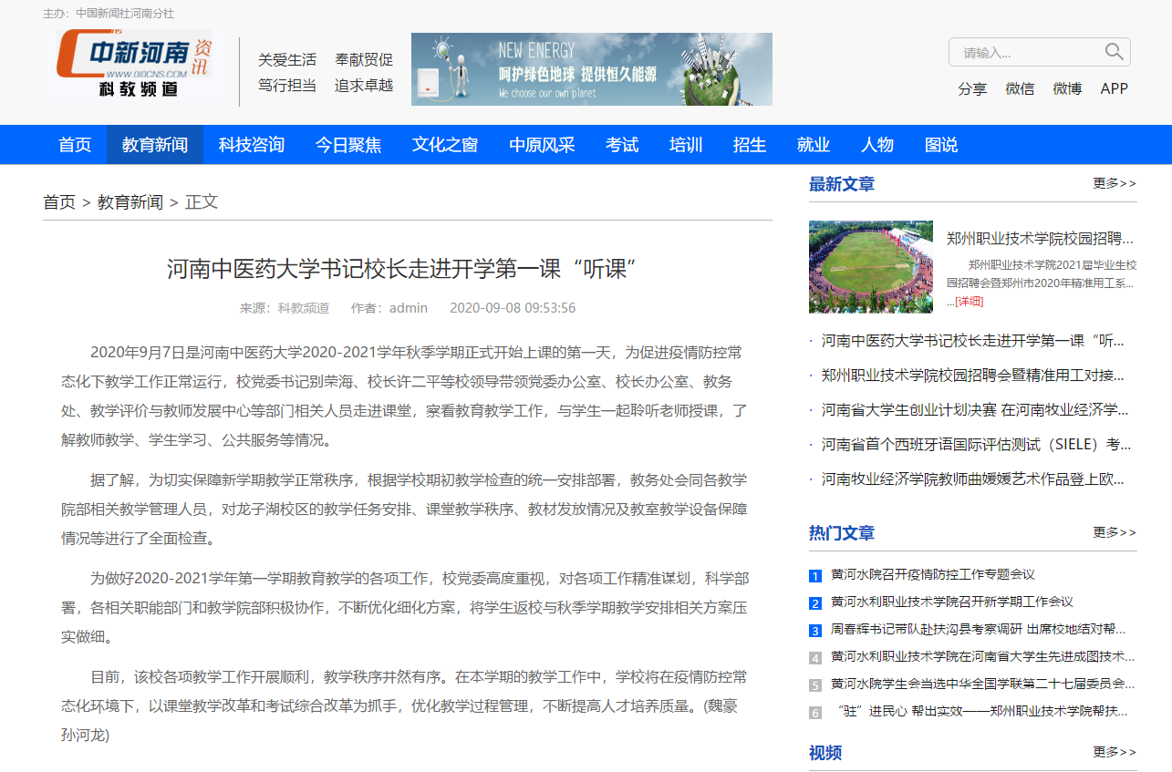编者按:2020年9月8日-10日,光明网、央广网、中国网、大河网、中华网、北国网、中新河南网、河南高校资讯网等多家媒体对leyu·乐鱼(中国)体育官方网站党委书记别荣海、校长许二平走进开学第一课“听课”进行报道。