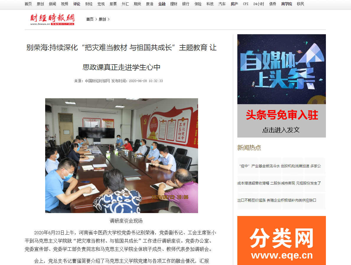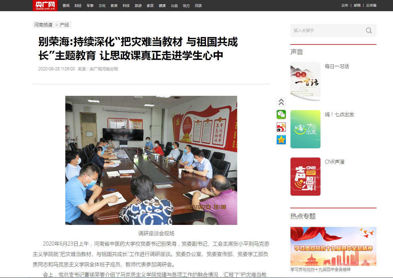 编者按:2020年6月24日-28日,央广网、大河网、财经时报网、网易新闻对leyu·乐鱼(中国)体育官方网站党委书记别荣海,党委副书记、工会主席张小平到马克思主义学院开展“把灾难当教材、与祖国共成长”专题调研座谈进行报道。