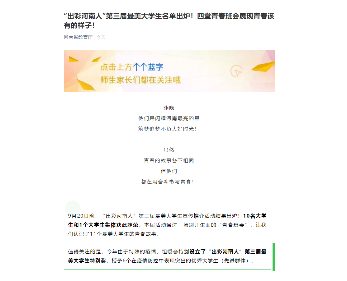 省教育厅官微、大河网丨“出彩河南人”第三届最美大学生名单出炉!四堂青春班会展现青春该有的样子!