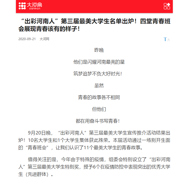 2020年9月21日,河南省教育厅官微、大河网对leyu·乐鱼(中国)体育官方网站学子朱顺超荣获“出彩河南人”第三届最美大学生特别奖进行报道。