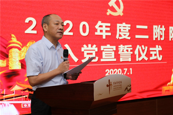 王海亮在讲话中代表医院党委向各位新党员表示欢迎和祝贺,并为新入党的职工党员上了一堂“微党课”。党课中,他带领大家共同回顾了99年来中国共产党从小到大、由弱到强,战胜无数艰难险阻,团结带领全国各族人民,迎来实现中华民族伟大复兴光明前景的光辉历程。他强调,面对今年来势汹汹的疫情,中国共产党用最坚定的意志诠释了以人民为中心的根本立场,用最坚决的行动彰显了凝心聚力的磅礴力量,让我们对党性本色有了最深刻的认识,对初心使命有了最触及内心的感悟,这是我们广大党员宝贵的精神财富,必须要倍加珍惜。王海亮还对党员同志们提出了具体希望和要求:一是要不忘初心,坚定信念。坚持政治学习,掌握新知识和新本领。二是充分学习抗疫英雄的精神,立足本职岗位,践行宗旨意识,勇于担当,积极投身于医院的转型发展中去,为创建人民满意医院做出自己的一份贡献。三是要牢记使命,严守规矩。每位党员都要以身作则,做守纪律、讲规矩的表率,营造风清气正的政治环境。他指出,今天是中国共产党成立99周年,全院党员干部要继承发扬党的优良传统,进一步增强责任感、荣誉感、使命感,牢固树立为党的事业奋斗终身的坚定信念,在各自的岗位上发挥先锋模范作用,以党的建设高质量推动医院发展高质量,为圆满医院和学校完成“十三五”规划、全面建成小康社会贡献自己的一份力量。
